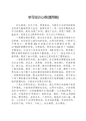 学习培训心得(通用稿)时光易逝,初冬乍现、寒意渐浓。为期半个月时间的紧张充实而又愉快的学习生活,就要结束了。用一句话来概括此次学习的感受,就是:收获了知识,增长了见识,拓宽了视野,获益良多。现结合自己的所学所获,谈几点认识和体会。一是理念得到更新。经过本次培训,我深深意识到面对知识更新、知识折旧日益加快的现实,必须与时俱进,不断学习,不断进步。特别是XX亲临培训班作专题辅导讲课,提出"XXX"的殷切希望,立意高远,意味深长;XX作了《XXX》专题报告,引发自己很多深层思考。XX参观之行,既领略了XX发展取得的巨大成就和丰富经验,又上了一堂生动的文化教育课,感受了奋斗历程,也使自己更加坚定了理想信念。二是眼界得到开阔。培训期间,各位授课老师紧密结合经济社会形势,讲业务、讲思路、讲发展,旁征博引,传授新理念、新方法,提出分析问题、解决问题的新角度、新思维。听了他们的课,我进一步认清了形势、坚定了立场、辨明了方向,更加深入地了解了当前发展面临的新机遇和新挑战。思想中的一些疑惑得到化解,眼光放得更加长远,自我加压,勇于担当,干净干事的意识更加明确,深深意识到只有积极融入发展大局,始终把握先机,才能充分实现自身价值。三是认识得到深化。通过培训,我认识到只有持续不断学习和锤炼,才能保持思想的纯洁性。必须方向坚定,以先进理论作为"夜明灯"、以崇高理想作为"驱动器"、以正确世界观、人生观、价值观作为"导航仪",做到忠诚、遵纪、守规;必须锤炼自我,精学理论、深学业务、广学知识,锻炼自己的人格、意志、心态和才干;必须求真务实,有务实的思路、务实的作风、务实的干劲,不唯书、不唯上,追求真理,反对谬误。总之,通过参加这次学习培训,让我坚定了信念,看到了差距,找到了不足,从中也感悟到了只有不断学习、不断进步,才能更好的履职担当。回到单位后,我将继续把学习作为推动工作的内生动力,坚持自我学习,自我提升,用孜孜不倦的学习不断提升能力素质,用踏踏实实的工作成效检验学习效果。