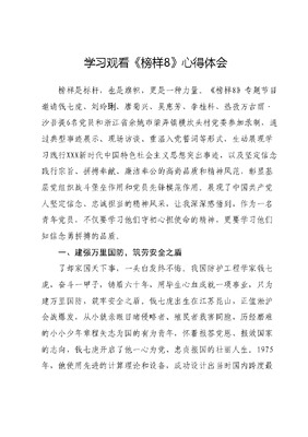 学习观看《榜样8》心得体会榜样是标杆,也是旗帜,更是一种力量。《榜样8》专题节目邀请钱七虎、刘玲、唐菊兴、吴惠芳、李桂科、热孜万古丽琍·沙吾提6名党员和浙江省余姚市梁弄镇横坎头村党委参加录制,通过典型事迹展示、现场访谈、重温入党誓词等形式,生动展现学习践行XXX新时代中国特色社会主义思想突出事迹,以及坚定信念践行宗旨、拼搏奉献、廉洁奉公的高尚品质和精神风范,彰显基层党组织战斗堡垒作用和党员先锋模范作用。展现了中国共产党人坚定信念、忠诚担当的精神风采,让我深深感悟到,作为一名青年党员,不仅要学习他们守初心担使命的精神,更要学习他们知信念勇拼搏的品质。一、建强万里国防,筑劳安全之盾了却家国天下事,一头白发终不悔。我国防护工程学家钱七虎,奋斗一甲子,铸盾六十年,用毕生心血成就一项事业,只为建万里国防,筑牢安全之盾。钱七虎出生在江苏昆山,正值淞沪会战爆发,从小就亲眼目睹侵略者、殖民者戕害同胞,历经磨难的小小少年章程矢志为国的有为青年,怀着报答党恩、报效国家的志向,钱七虎开启了他一心为党、忠贞报国的壮丽人生。1975年,他使用先进的计算理论和设备,成功设计出当时国内跨度最大、抗力最高的飞机洞库防护门,为空军战场上的及时反击赢得时间和机会。经过近千次细致分析计算,他创造性地提出建设深地下防护工程的总体构想。经过10年持续攻关,构建出破碎区受限内摩擦模型等计算理论和防护技术,为我国战略工程安全装上金钟罩。工作中,他耐心细致、兢兢业业。把毕生心血熔铸在地下飞机库、停车场,熔铸在抗各种打击的坑道、指挥所熔铸在抗击冲击波冲击的较量之中。60余载光阴与满头华发60余载上下求索,铸就泰山崩于前而不变色之盾。和平年代本该安享晚年,钱七虎却以耄耋之躯,主动肩挑国家大计。南水北调、西气东输,能源储备、地下工程、港珠澳大桥……凡是关乎国家大计的防护工程,都能看到钱老奔波的足迹。二是永葆军人本色,建设最美乡村全国最美退役军人吴惠芳,参加过边境自卫反击战、98抗洪等重大任务,17年前,吴惠芳怀揣让乡亲们跟上时代步伐过上更加美好生活的梦想,脱下军装,不要国家安置,毅然选择自主择业,回到家乡永联村。2005年9月,刚来到永联村的他便进入了一种理论换装、知识更新的恶补状态——每天凌晨四五点钟起床,学习农村政策法规知识,沉下心来,理清头绪,找准方向。系统提出居住方式城镇化、生产方式产业化、生活方式市民化、管理方式规范化、就业方式多样化、收入方式多元化的新农村建设标准。吴惠芳带领大家修图书馆、建小戏楼、筑休闲广场……用文化滋养文明;创立家庭文明奖、建设爱心互助街、成立永联志愿者联合会……用爱心浇灌文明。17年来,这位全国优秀共产党员、全国最美退役军人荣誉称号获得者永葆军人本色,发扬部队听党指挥、服务人民、英勇善战的优良传统,积极投身乡村振兴的战场,在他的带领下,永联发展成为现代化新农村建设的排头兵,带领全村百姓书写了乡村振兴的永联答卷。吴惠芳同志三是点亮希望之星,守护人民健康1981年4月,白族小伙李桂科入职洱源县卫生防疫站,当时的山石屏村,被一条黑江与外界隔绝,人员外出和物资运输只能潓靠渡船,艰苦的环境并没有击退李桂科,他把麻风防治工作当作自己的事业,把麻风院当作自己的家,把麻风病康复者及家属当作自己的亲人。为帮助麻风病患者治愈心灵,重新融入社会,他与康复人员同吃同住同劳动,为做父母的解决子女读书、工作问题,替做子女的赡养老人,一干就是几十年,带领村民在黑江潓上架起了人行索道桥,解决了用电问题,修缮危房,他和村民一起修建蓄水池,种植核桃,养猪、养鸡、养牛、养羊,进行环境绿化改造,带领村民走上了脱贫致富的道路将山石屏建成了可供旅游度假的新村。42年的坚守,李桂科将一个与世隔绝的麻风院建成了黑江边一座通路、通桥、通电、通水、通网络的美丽家潓园,摘掉了人人惧怕的麻风村的帽子,变成了人人向往的幸福村。《榜样8》通过一个个榜样的力量,营造崇德向善、明德惟馨的社会氛围,为加快建设展现强富美高新图景的社会主义现代化强市提供强大精神力量和丰润道德滋养。他们的故事不相同但身上都有着优秀共产党员所必备的品质,同时也有着他们独特的特点。他们与时俱进、开拓创新,他们紧跟时代前进的步伐,不断的研究新情况,解决新问题,克服前进道路上的重重困难,在不断的追求中实现了人生价值的升华。在工作实践中勇于探索太胆实践,创造性的去开展工作,在平凡的岗位上建功立业,不断开创改革和发展的新局面。作为一名党员干部,要学习他们拼搏事业的精神,他们就像一座座灯塔,指引人们向上向善向好,不断浩渺行无极,杨帆但信风,他们身上所体现出的品质正是我前进的方向和目标,更让我坚定做一名合格党员的决心,勇担时代重任的勇气,不怕苦,不怕难,立足自身领域,增强自身本领,
