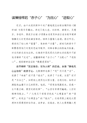 读懂榜样的赤子心为民心进取心近日,由中央组织部和中央广播电视总台联合制作的《榜样8》专题节目播出,讲述了钱七虎、刘玲琍、唐菊兴、吴惠芳、李桂科、热孜万古丽·沙吾提6名党员和浙江省余姚市梁弄镇横坎头村党委的典型事迹。榜样力量催人奋进,透过节目,感受到了初心的重量、使命的力量。新时代的青年干部要感悟他们对党的忠诚与敬仰、对革命事业的热诚与执着、对名利的无我与淡然,在推进中国式现代化的生动实践中不断追寻榜样足迹,读懂榜样的赤子心为民心进取心,感悟榜样背后的殷殷爱国情。追寻榜样笃定信念、甘为人梯的足迹,永葆静我凡心立功名的赤子心。无数榜样选择了民而不是名,选择了奉献而不是索求,选择了为党、为国而不是为自己。如同钱七虎同志以国为重、名利为轻,始终以满腔热血履行自己的职责。他说,爱党信党跟党走,是我一生中最正确、最坚定的选择。山因有脊梁而巍峨,人因有精神而挺立。广大党员干部要寻找成从哪里来的密码,标定出往哪里去的航向,在赶考路上做远大理想和共同理想的信仰者、追梦者、实践者,把人生理想融入党和人民事业之中,才能真正经得起各种风浪的考验,做到静我凡心立功名的高尚境界。还要把稳思想之舵、补足精神之钙,永葆对党绝对忠诚的政治本色,在思想上不滑坡,在认识上不动摇,坚定不移地做两个确立的坚决拥护者、两个维护的坚定践行者,把对党忠诚、信念坚定成为新时代赶考路上最鲜明的本色。追寻榜样实干担当、全心为民的足迹,涵养不兴伪事兴务实为民心。刘玲琍同志32年手捧星月,为折翼天使插上追梦翅膀。她始终坚守在特殊教育一线,坚守特教初心,传递无声大爱,为听障孩子撑起一片天。实干是行路之车,广大党员干部要牢记空谈误国,实干兴邦,明白只有向下扎根,才能汲取向上生长的力量,只有接地气才能蕴底气,成为干事创业的急先锋,解决群众的烦心事、揪心事,做群众知冷知热的贴心人,不停留于功劳簿,不止步于娄山关,把个人小我融入国家大我,勇于担当敢作为,一颗恒心干到底;要在认真履职中练出真功夫、真本领,多当几回热锅上的蚂蚁,多接几次烫手的山芋,切实把为民工作做实、做深、做细;更要在心和情上绵绵用力,永葆为民心,彰显为民情,心中装得下百姓,行动上服务百姓,始终把党和人民的利益放在心中最高的位置,不断凝练俯首甘为孺子牛的为民精神。追寻榜样恒志笃行、敢于斗争的足迹,常怀直挂云帆济沧海进取心。无论是李桂科毅然留下,为病人奔波操劳四十多年,那句我会一如既往,努力做好该做的事情,还是唐菊兴干事创业,敢于走出舒适区,那句高原探矿,再践行,我都会坚持下去铮铮誓言,都彰显恒志笃行、敢于斗争的崇高品质。立志不坚,终不济事。广大党员干部要把发扬钉钉子精神,一锤接着一锤敲,一茬接着一茬干,以经年累月的实际行动,钉牢为民服务的每一粒钉子,以只争朝夕的劲头和坚韧不拔的毅力,笃行不怠走向未来,以永远在路上的坚定执着,持续用力,把内心的坚韧转化为扎根人民的源头活水。要坚定斗争意志,不屈不挠、一往无前,以欲与天公试比高的奋斗拼劲,敢教日月换新天的冲天干劲,在困难矛盾中经磨砺,在风险挑战中壮筋骨,像广大榜样在斗争中总结经验,提升斗争本领一样,做到无愧于党、无愧于人民、无愧于时代,奋力书写更加灿烂绚丽的人生答卷。