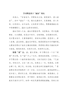 学习理论多下涵泳功夫朱熹云,学者读书,须要敛身正坐,缓视微吟,虚心涵泳。其中涵泳一词,意为沉潜其中、反复推敲、深入体味、以获真知。读书治学,尤其是学习理论,想要掌握蕴含其中的精髓要义,涵泳之法是有效路径。涵泳乃深入之法。涵泳非囫囵吞枣、浅尝辄止,更非生搬硬套、大水漫灌,而是由外到内、由粗到细、由现象到本质,逐步置身其中、反复琢磨研究、深刻体会领悟,层层深入、渐入佳境、直至彻悟。涵泳式学理论,既要把理论知识学懂弄通,也要深挖理论产生的土壤追根溯源,更要明白理论内蕴的规律与脉络,做到知其然、知其所以然、知其所以必然。掌握涵法。涵,重在浸染。学习理论是一个求进境的过程,在涵字上下功夫,做到层层浸染,以求深入。学习理论是一个循序渐进的过程。《朱子语类》记载:凡读书,须有次序。且如一章三句,先理会上一句,待通透;次理会第二句,第三句,待分晓;然后将全章反复紬绎玩味。要按照连贯的思维程序一步一步来、扎扎实实学,做到拾级而上、逐步深入。要讲究力度。理论灌输如春雨润物、清渠灌田,应根据自身的理论素养、学习需求、接受能力等,选择相应难易度进行差异化学习。如果一味狂风暴雨高强度灌输,则难以消化吸收;倘若雨过地皮湿、蜻蜓点水,只知其表不知其本,则难以学深悟透。要把握进度。学习理论当知心急吃不了热豆腐的道理,要根据实际情况掌握好进度,不可一次推进太多,给消化吸收阶段预留相应的时间。学习理论是一个孜孜不倦的过程,须保持板凳要坐十年冷的执着,绵绵用力、久久为功,锲而不舍、一以贯之,方可学到精髓、收获真谛。学习理论更是一个学无止境的过程。理论创新每前进一步,理论武装就要跟进一步。要常怀本领恐慌之心,秉持如饥似渴的学习态度,紧跟党的理论创新步伐,先学一步、深学一层,不断提高理论素养。掌握泳法。泳,重在深入环境。学习理论不能停留在岸上空喊口号,一定要如鱼到水中游,沉潜进去、沉浸其中。一方面,要深入到理论体系中去学习理论,通过耳濡目染、学思践悟来掌握理论、精通理论;另一方面,要到实践中去学习理论,积极投身岗位实践、任务实践,在实践中检验理论、总结经验,形成理性认识,并上升为新的理论认知。同时要注意到,这两个方面不是孤立存在的,既不能单纯就理论学习理论,也不能脱离理论搞实践,二者要进行有机结合,并在循环往复中实现理论素养进阶。泳法,是驾驭之法。毛泽东同志指出:指挥员在战争的大海中游泳,他们要不使自己沉没,而文可居文库——海量学习资料,手机电脑均可下载www.wenkeju.com要使自己决定地有步骤地到达彼岸。作为战争指导规律的战略战术,就是战争大海中的游泳术。学习理论不只是读懂书本上的文字,更重要的是能够驾驭理论。驾驭理论在于探索掌握理论所揭示的规律,并联系实际机动灵活运用理论中蕴含的立场、观点、方法指导实践,把理论学习成效转化为驾驭全局、推动工作的能力。优游涵泳是一种境界。古代哲人提倡学习优游涵泳,从容求索、深入体会。教育家朱光潜对优游涵泳理解为猛火煎后的慢火煨,紧张工作后的潜意识的酝酿。学习理论是常功、慢功、硬功,不可急迫躁进,集中灌输之后的慢煨酝酿是极其重要环节。要胜任领导工作,需要掌握的本领是很多的。最根本的本领是理论素养。党员干部须多在涵泳二字上下功夫,深入学理论、悟思想,切实提升理论素养,提高理论指导实践的能力,不断开创事业发展新局面。文可居文库——海量学习资料,手机电脑均可下载www.wenkeju.com