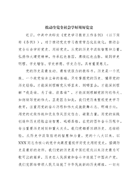 推动全党全社会学好用好党史近日,中共中央印发《党史学习教育工作条例》(以下简称《条例》),对于推动党史学习教育常态化长效化,推动全党全社会学好党史、用好党史,从党的历史中汲取智慧和力量,弘扬伟大建党精神,传承红色基因,赓续红色血脉,做到学史明理、学史增信、学史崇德、学史力行,具有重要意义。党的历史是最生动、最有说服力的教科书。历史是一个民族、一个政党安身立命的基础。只有掌握党的历史、懂得党的历史经验,才能深刻理解党从哪里来、到哪里去,才能深刻理解我是谁、为了谁、依靠谁,才能深刻理解党因何而伟大、如何续写党的伟大。正是因为如此,我们党历来重视党史学习教育,注重用党的奋斗历程和伟大成就鼓舞斗志、明确方向,用党的光荣传统和优良作风坚定信念、凝聚力量,用党的实践创造和历史经验启迪智慧、砥砺品格。在党的百年奋斗历程中,每当重要历史时刻和重大关头,我们党都要回顾历史、总结经验,从历史中汲取前进的智慧和力量。党的十八大以来,以XXX同志为核心的党中央高度重视学好党史用好党史,强调历史是最好的老师。我们党的历史是中国近现代以来历史最为可歌可泣的篇章,历史在人民探索和奋斗中造就了中国共产党,我们党团结带领人民又造就了中华民族新的历史辉煌。一切向前走,都不能忘记走过的路,走得再远、走到再光辉的未来,也不能忘记走过的过去,不能忘记为什么出发。中国革命历史是最好的营养剂,重温这部伟大历史能够受到党的初心使命、性质宗旨、理想信念的生动教育,必须铭记光辉历史、传承红色基因。特别是2021年在全党开展的党史学习教育,取得了重要政治成果、理论成果、实践成果、制度成果,广大党员干部得到了一次全面深刻的政治教育、思想淬炼和精神洗礼。党的XXX报告提出,坚持理论武装同常态化长效化开展党史学习教育相结合。《条例》的制定和实施,就是推动党史学习教育常态化长效化的具体举措,为做好党史学习教育工作提供了有力制度保障。深学笃行、知史爱党、知史爱国。XXXXXX强调:在全党开展党史学习教育,是牢记初心使命、推进中华民族伟大复兴历史伟业的必然要求,是坚定信仰信念、在新时代坚持和发展中国特色社会主义的必然要求,是推进党的自我革命、永葆党的生机活力的必然要求。要全面贯彻XXX新时代中国特色社会主义思想,在推动全党全社会学好党史用好党史中深刻领悟两个确立的决定性意义,增强四个意识、坚定四个自信、做到两个维护。坚持党史学习教育全覆盖,把党员干部学习和普通群众学习有效结合起来。坚持理论学习与文可居文库——海量学习资料,手机电脑均可下载www.wenkeju.com历史学习有效结合,把学习党的创新理论同常态化长效化开展党史学习教育相结合。坚持全面吃透与突出重点相结合,强调认真学习党的三个历史决议,全面系统学习党史,强调学习和运用党在长期奋斗中积累的宝贵历史经验。坚持健全完善制度机制和创新学习方式方法。坚持用好学校思政课主渠道与充分利用红色资源、媒体宣传和基层宣传宣讲等形式相结合,切实增强党史学习教育的系统性、针对性、有效性。以史为鉴,开创未来。注重学习和总结历史、借鉴和运用历史经验,是我们党由小到大、由弱到强、不断走向胜利的成功之道。XXXXXX指出:今天,我们回顾历史,不是为了从成功中寻求慰藉,更不是为了躺在功劳簿上、为回避今天面临的困难和问题寻找借口,而是为了总结历史经验、把握历史规律,增强开拓前进的勇气和力量。学习党史是坚持和发展中国特色社会主义、把党和国家各项事业推向前进的必修课,这门课不仅必修,而且必须修好。修好了这门课,我们才能更好地树立正确的历史观,准确把握党的历史发展的主题主线、主流本质。正确对待党在前进道路上经历的失误和曲折,坚决反对和抵制历史虚无主义。看清楚过去我们为什么能够成功、弄明白未来我们怎样才能继续成功,从而更加坚定、更加自觉地践行初心使命,在新时代更好坚持和发展中国特色社会主义。文可居文库——海量学习资料,手机电脑均可下载www.wenkeju.com党的十八大以来,以XXX同志为核心的党中央,以伟大的历史主动精神、巨大的政治勇气、强烈的责任担当,统揽四个伟大,推动党和国家事业取得历史性成就、发生历史性变革,书写了在党史、新中国史、改革开放史、社会主义发展史、中华民族发展史上具有里程碑意义的伟大史诗。以《条例》施行为契机,推动全党全社会学好党史、用好党史,从党的历史中汲取智慧和力量,坚定信心、勇毅前行,奋力谱写以中国式现代化全面推进中华民族伟大复兴的崭新篇章!文可居文库——海量学习资料,手机电脑均可下载www.wenkeju.com