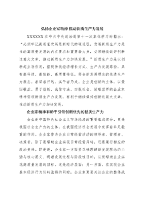 弘扬企业家精神 推动新质生产力发展XXXXXX在中共中央政治局第十一次集体学习时指出:必须牢记高质量发展是新时代的硬道理,发展新质生产力是推动高质量发展的内在要求和重要着力点,必须继续做好创新这篇大文章,推动新质生产力加快发展。新质生产力是以创新起主导作用,摆脱传统经济增长方式、生产力发展路径,具有高科技、高效能、高质量特征,符合新发展理念的先进生产力质态。善谋者行远,实干者乃成。企业是创新的主体,以爱国敬业、勇于创新、诚信守法、回报社会、放眼世界的企业家精神引领新质生产力发展,有利于继续做好创新这篇大文章,推动新质生产力加快发展。企业家精神有助于引领创新优先的新质生产力企业是中国特色社会主义市场经济的重要组成部分,更是我国社会生产力的主体,在我国经济社会发展中发挥着举足轻重的作用。企业家作为企业日常经营活动的领导者、管理者、决策者,除了要帮助企业实现日常经营周转,还要履行相应的政治责任。即是说,企业家一方面要正确理解新发展理念的内涵与核心要义、明晰发展过程与阶段性目标,从而帮助企业实现高质量发展的目标,这是经济层面;另一方面,在实现企业基本经济行为运转流畅的同时,企业家更要关注企业的整体战略规划是否与中央步调保持一致,要在思想和实践上为企业发展指好向、把稳舵,这是政治层面。企业家精神作为企业的重要灵魂,是企业领导力、创造力的源泉。如果一个企业失掉了企业家精神,就会陷入利润陷阱,只关注经济收益,而忽视社会效益。因此,弘扬企业家精神,不仅可以明确企业发展的度、兼顾经济收益与社会效益,还能将企业的思想政治优势转化为企业的经济优势。现如今,我国已然迈上了通往社会主义现代化强国的建设之路。要实现社会主义现代化,首要任务是实现高质量发展。为此,XXXXXX强调:高质量发展需要新的生产力理论来指导,而新质生产力已经在实践中形成并展示出对高质量发展的强劲推动力、支撑力。新质生产力作为以创新起主导作用,摆脱传统经济增长方式、生产力发展路径,具有高科技、高效能、高质量特征,符合新发展理念的先进生产力质态,如果企业不能很好地理解把握,那么不仅可能无法发挥其应有之力,甚至还可能成为我国现代化建设路上的掣肘。因此,积极弘扬勇于创新、敢为天下先的企业家精神则具有不可言喻的重要意义。富有之谓大业,日新之谓盛德。XXXXXX指出:企业家的创新活动是推动企业创新发展的关键。可以说,企业的创新发展直接影响新质生产力的形成。因此,加快形成新质生产力,就要坚持发扬企业家精神,文可居文库——海量学习资料,手机电脑均可下载www.wenkeju.com将其内化于心、外化于行。一方面,企业在经营运作上要把牢创新是引领发展的第一动力基本原则,以高质量管理赋能生产创新;另一方面,企业在发展策略上亦要体现敢于第一个吃螃蟹的闯劲,敢于承担风险,并在教训中不断总结经验,以取得突破。复兴路上,百业艰难,但危中有机,唯改革者强,唯创新者胜。企业要争做技术创新的爆破手与探索者,勇于推动生产组织创新、技术创新、市场创新,重视技术研发和人力资本投入,有效调动员工创造力,进而实现生产力的跃迁,引领创新优先的新质生产力发展。企业家精神有助于引领绿色生产的新质生产力绿色发展是高质量发展的底色,新质生产力本身就是绿色生产力。需要注意的是,新质生产力之质在于高质量发展。XXXXXX指出:高质量发展,就是能够很好满足人民日益增长的美好生活需要的发展,是绿色成为普遍形态的发展。囿于制度痼疾,资本主义发展难以破解发展与稳定、公平与效率、先富与共富等诸多问题,因为它说到底无法推进高质量发展。改革开放以来,我国经济迎来了指数型增长,经济发展效率节节高。由于受到西方利己主义、实用主义、经济至上主义等错误思潮的蛊惑,经济发展中也存在一些只注重或崇拜眼前的经济利益与效益指标,盲目追求利润最大化,带来了人与人、人文可居文库——海量学习资料,手机电脑均可下载www.wenkeju.com与社会以及灵与肉的巨大紧张,影响了生产力发展。为此,企业家积极弘扬和践行企业家精神,承担社会责任、道德责任,道德经营,对于法律明文要求的生态规范要严格执行,对于部门不当的生产行为要严格约束,对于企业过时的生产思路要加速转变。XXXXXX在《中共中央关于党的百年奋斗重大成就和历史经验的决议》中指出:生态文明建设是关乎中华民族永续发展的根本大计,保护生态环境就是保护生产力,改善生态环境就是发展生产力,决不以牺牲环境为代价换取一时的经济增长。绿水青山也是金山银山。经济增长与环境保护不是绝对对立的,而是辩证统一、相互转化的关系,自在自然只有与人化自然处于动态平衡之中,才能推动传统生产力向新质生产力的转化。因此,企业家在带领企业发展中要努力践行绿色发展、协调发展的理念,积极承担和