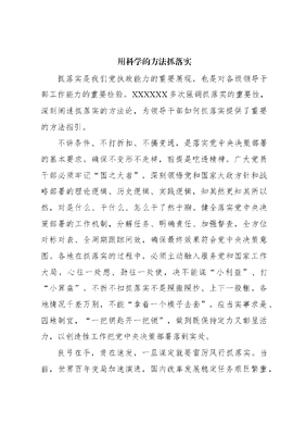 用科学的方法抓落实抓落实是我们党执政能力的重要展现,也是对各级领导干部工作能力的重要检验。XXXXXX多次强调抓落实的重要性,深刻阐述抓落实的方法论,为领导干部如何抓落实提供了重要的方法指引。不讲条件、不打折扣、不搞变通,是落实党中央决策部署的基本要求。确保不变形不走样,前提是吃透精神。广大党员干部必须牢记国之大者,深刻领悟党和国家大政方针和战略部署的理论逻辑、历史逻辑、实践逻辑,知其然更知其所以然,对是什么、干什么、怎么干了然于胸。健全落实党中央决策部署的工作机制,分解任务、明确责任、加强督查,全方位对标对表、全周期跟踪问效,确保最终效果符合党中央决策意图。各地在抓落实的过程中,必须主动融入服务党和国家工作大局,心往一处想、劲往一处使,决不能谋小利益、打小算盘。不折不扣抓落实不是照搬照抄、上下一般粗。各地情况千差万别,不能拿着一个模子去套,应当实事求是、因地制宜,一把钥匙开一把锁,做到既保持定力又彰显活力,以创造性工作把党中央决策部署落到实处。良弓在手,贵在速发,一旦谋定就要雷厉风行抓落实。当前,世界百年变局加速演进,国内改革发展稳定任务艰巨繁重,任何犹豫、观望、懈怠都会丧失战略主动。永葆时不我待和只争朝夕的奋斗姿态,抓住一切有利时机,利用一切有利条件,在危机中育新机、于变局中开新局。这就要求各级党员干部具备见微知著的敏锐眼光,准确判断时与势、危与机、利与弊,明确应尽之责、必做之事、当务之急。对看准的工作,立说立行、紧抓快办,能早干就早干、能多干就多干,努力以自身工作的确定性来应对形势变化的不确定性。当然,雷厉风行不是一味求快、盲动妄为,必须把握好时度效,正确处理稳与进、立与破、当前与长远的关系,把马上就办和久久为功有机结合起来,多干打基础利长远的事,以功成不必在我的境界创造功成必定有我的业绩,真正做到对历史和人民负责。抓落实来不得半点花拳绣腿,必须真抓实干。中央经济工作会议部署的九项重点任务都不是轻轻松松就可以完成的,必须在求真务实上狠下一番功夫。秉持真字,正确认识经济社会运行规律,识别事物本质,抓住问题关键,把握政策尺度,使每项具体工作措施都符合实际情况、符合科学精神。锚定实字,扑下身子当好施工队长,一竿子插到底抓落实,真正做到干实事、谋实招、求实效。大兴调查研究之风,落实四下基层制度,及时了解新情况新问题,破除贯彻落实中的难点堵点痛点。盯牢细字,坚持精细施策、精准发力,文可居文库——海量学习资料,手机电脑均可下载www.wenkeju.com把工作往深里做、往细里做,以工匠精神练就绣花功夫,打通工作落实的最后一公里。形式主义、官僚主义是抓落实的大敌。领导干部要树立正确政绩观,纠治摆花架子、刮一阵风、过度留痕等不正之风,切实为基层和企业减负,让干部群众精力真正用在干实事上。推动决策部署落地开花,既要有敢作的气魄和担当,也要有善为的才识和谋略。领导干部要有一股闯劲,发扬斗争精神,逢山开路遇水架桥,勇于闯难关、蹚新路,敢于扛事、敢为人先。只要符合大政方针、符合基层实际、符合群众利益,就要大胆闯、大胆试、坚决干。保持一股钻劲,勤于学习、乐于学习、善于学习,干什么学什么、缺什么补什么,不断提高把握新发展阶段、贯彻新发展理念、融入新发展格局的政治能力、战略眼光、专业水平。铆足一股韧劲,立下愚公移山志,咬定青山不放松,发扬钉钉子精神,一锤接着一锤敲,积小胜为大胜,积跬步以至千里。干部是抓落实的关键。高质量落实,归根到底要靠千千万万勇于担当、本领高强的好干部。各级党委政府应当树立正确选人用人导向,落实三个区分开来,健全容错纠错机制,旗帜鲜明地为担当者担当、为负责者负责、为干事者撑腰,引导广大党员干部脚踏实地狠抓落实,争当坚定的执行者、行动文可居文库——海量学习资料,手机电脑均可下载www.wenkeju.com派、实干家。文可居文库——海量学习资料,手机电脑均可下载www.wenkeju.com