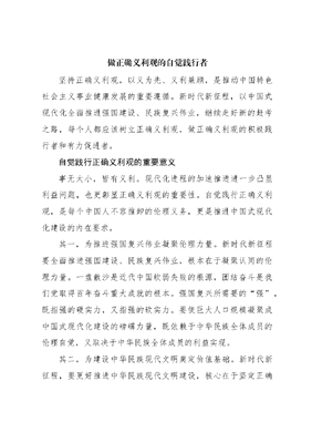 做正确义利观的自觉践行者坚持正确义利观,以义为先、义利兼顾,是推动中国特色社会主义事业健康发展的重要遵循。新时代新征程,以中国式现代化全面推进强国建设、民族复兴伟业,继续走好新的赶考之路,每个人都应该树立正确义利观,做正确义利观的积极践行者和有力促进者。自觉践行正确义利观的重要意义 事无大小,皆有义利。现代化进程的加速推进进一步凸显利益问题,也更彰显正确义利观的重要性。自觉践行正确义利观,是每个中国人不容推卸的伦理义务,更是推进中国式现代化建设的内在要求。其一,为推进强国复兴伟业凝聚伦理力量。新时代新征程要全面推进强国建设、民族复兴伟业,根本在于凝聚认同的伦理力量。一盘散沙是近代中国软弱失败的根源,团结奋斗是我们党取得百年奋斗重大成就的根本。强国复兴所需要的强,既指强的硬实力,又指强的软实力。要使巨大人口规模凝聚成中国式现代化建设的磅礴力量,既依赖于中华民族全体成员的伦理自觉,又取决于中华民族全体成员的利益实现。其二,为建设中华民族现代文明奠定价值基础。新时代新征程,要更好推进中华民族现代文明建设,核心在于坚定正确的价值方向。人类文明在发展过程中,始终存在人与物的价值冲突问题。资本主义现代化以追逐资本为价值取向,成为丧失灵魂、湮灭人性的根源,更是全球问题、国际冲突的祸首。义,人之正路也。物质富足、精神富有是中国式现代化的根本要求,构成中华民族现代文明建设的价值基础。只有人人自觉践行正确义利观,奉行义利并举、以义为先的原则,才能不断创造适合人自由全面发展的美好生活。其三,为扎实推进共同富裕构建公平秩序。新时代新征程要扎实推进共同富裕,关键在于构建公平的经济社会秩序。共同富裕不是平均主义,不是劫富济贫。共同富裕是众人所同欲的奋斗目标,依靠制度创新营造持久公平的伦理秩序。遵循面向共同富裕的正确义利观,每个人依靠劳动创造幸福,劳动就是每个人有保障的生产性公平;做大蛋糕的同时公平分配好蛋糕,合理分配就是对共同富裕进行调控的伦理性公平;先富在创造更多财富的同时带动后富,通过慈善方式帮扶老弱病残就是起补充作用的美德性公平。自觉践行正确义利观的内容向度 行其当行,义利自明。新征程上自觉践行正确义利观,就是在投身中国式现代化事业中,正确认识、把握、处理义与利的关系,解决我是谁、为了谁、依靠谁的根本问题。文可居文库——海量学习资料,手机电脑均可下载www.wenkeju.com首先,在公与私关系上,公私分明是基本操守,公而忘私是崇高境界。中国式现代化是社会主义性质的现代化,必须正确处理公与私的关系。公则天下平,全面推进中国式现代化,要立公之大义,树立正确的价值观、权力观、事业观,做到公私分明、克己奉公、严格自律。其次,在群与己关系上,善群而又成己。中国式现代化是群体性合作事业,必须正确处理群与己的关系。广大人民群众积极参与中国式现代化事业,在致力于实现中华民族伟大复兴的历史进程中,也在不断追求和实现个人的美好生活。中国式现代化是亿万人民自己的事业,人尽其才是关键支撑,才尽其用、分工合作,就是群己统一、义利一体,就是美人之美、各美其美。中国式现代化坚持以人民为中心,只有每个人都有主动性和创造性,才能汇聚民智立长远创一流,确保与人同利各得其所。因而现代群己关系既要筑牢共同利益基础,更要夯实创新创造的共同事业根基。最后,在心与身关系上,正心而又立身。中国式现代化的最终目标是实现人自由而全面的发展,必须正确处理身与心的关系。义者,为之,人也。中国式现代化的本质是人的现代化,成为独立自主、相互平等的个人,方能合力推动全面建设社会主义现代化国家。现代人追求和享受美好文可居文库——海量学习资料,手机电脑均可下载www.wenkeju.com生活,就要超越对物的依赖,在身心关系上实现义利合一,否则身为物役,心也将被物化。因此,现代人需自觉践行正确义利观,抵制物对心的侵蚀。自觉践行正确义利观的长效路径 学无浅深,辨行义利。新征程上自觉践行正确义利观,基础在知,根本在信,重点在规,关键在行。必须不断探索自觉践行正确义利观的长效路径。第一,行以信立的思想发动。自觉践行正确义利观,需要自内而外的思想发动。理论上清醒,行动上就清楚。顺理而行信以行义。正确义利观广大而精微,必须深刻领会才能做到学思用贯通,深刻把握才能做到知信行合一,真正实现内化于心、外化为行。正确义利观高明而悠远,要从方向上认识其科学性,从比较上认识其优越性,从实践上认识其重要性,成为敬然后诚者。要牢牢掌握马克思主义立场观点方法,自觉践行社会主义核心价值观,从思想深处筑牢立信以行的动力之源。第二,权以法度的榜样带动。自觉践行正确义利观,需要自上而