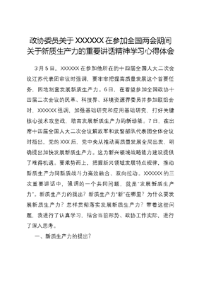 政协委员关于XXXXXX在参加全国两会期间关于新质生产力的重要讲话精神学习心得体会3月5日,XXXXXX在参加他所在的十四届全国人大二次会议江苏代表团审议时强调,要牢牢把握高质量发展这个首要任务,因地制宜发展新质生产力。6日,在看望参加全国政协十四届二次会议的民革、科技界、环境资源界委员并参加联组会时,XXXXXX强调,加强基础研究和应用基础研究,打好关键核心技术攻坚战,培育发展新质生产力的新动能。7日,在出席十四届全国人大二次会议解放军和武警部队代表团全体会议时指出,党的XXX后,党中央从推动高质量发展全局出发,明确提出加快发展新质生产力。这为新兴领域战略能力建设提供了难得机遇。要乘势而上,把握新兴领域发展特点规律,推动新质生产力同新质战斗力高效融合、双向拉动。XXXXXX的三次重要讲话中,强调的一个共同问题,就是发展新质生产力。新质生产力的提出?新质生产力新在哪里?为什么要发展新质生产力?怎样贯彻落实发展新质生产力?带着这些问题,我进行了认真学习,结合当前形势、政协工作实际,进行了深入思考。一、新质生产力的提出?2023年9月初,XXXXXX在黑龙江考察调研时指出,要以科技创新引领产业全面振兴;整合科技创新资源,引领发展战略性新兴产业和未来产业,加快形成新质生产力。2023年12月召开的中央经济工作会议强调,要以科技创新推动产业创新,特别是以颠覆性技术和前沿技术催生新产业、新模式、新动能,发展新质生产力。2024年1月,在二十届中央政治局第十一次集体学习时,XXXXXX强调,发展新质生产力是推动高质量发展的内在要求和重要着力点,必须继续做好创新这篇大文章,推动新质生产力加快发展。区政协紧扣时代脉搏,强化思想政治引领。去年9月21日,潘主席在历城区政协学习贯彻XXX新时代中国特色社会主义思想主题教育第一专题读书班上,首次就新质生产力做了重点解读。这让我们第一时间领悟了新思想新理论。二、新质生产力新在哪里?XXXXXX曾凝练概括,特点是创新,关键在质优,本质是先进生产力。外媒评论认为,这一概念将为中国加快经济转型带来新的动力。通过这一份事关未来的施政安排,中国希望利用高科技和技术革命突破来催生生产力。文可居文库——海量学习资料,手机电脑均可下载www.wenkeju.com新质生产力新在四个方面:新劳动者,如能充分利用现代技术的新型人才;新劳动对象,如数据要素;新劳动工具,如生成式人工智能;新型基础设施,如大数据中心等。新质生产力,主要包含战略性新兴产业和未来产业。战略性新兴产业主要有8个领域:新一代信息技术、新能源、新材料、高端装备、新能源汽车、绿色环保、民用航空、船舶与海洋工程装备;未来产业主要有9个领域:元宇宙、脑机接口、量子信息、人形机器人、生产式人工智能、生物制造、未来显示、未来网络、新型储能。三、为什么要发展新质生产力?XXXXXX指出,高质量发展需要新的生产力理论来指导,而新质生产力已经在实践中形成并展示出对高质量发展的强劲推动力、支撑力,需要我们从理论上进行总结、概括,用以指导新的发展实践。发展新质生产力是推动高质量发展的内在要求和重要着力点,必须继续做好创新这篇大文章,推动新质生产力加快发展。进入新的发展阶段后,人民对美好生活的需要体现在物质生活、精神生活、生态环境、文化体验等多个方面,对国家的经济发展、社会公共服务、环境质量、法治建设等提出了更高文可居文库——海量学习资料,手机电脑均可下载www.wenkeju.com要求。中国式现代化必须以高度发展的社会生产力和坚实的物质基础为支撑,加快形成新质生产力是当务之急李强总理在今年政府工作报告中强调,大力推进现代化产业体系建设,加快发展新质生产力。这是新质生产力首次在政府工作报告中出现,并被列为今年政府工作十大任务之首。四、怎样贯彻落实发展新质生产力?在参加江苏代表团审议时,XXXXXX立足一域,放眼全国,阐释了中国发展新质生产力的为与不为。如何为?强调因地制宜这四个字。各地要坚持从实际出发,先立后破、因地制宜、分类指导,根据本地的资源禀赋、产业基础、科研条件等,有选择地推动新产业、新模式、新动能发展,用新技术改造提升传统产业,积极促进产业高端化、智能化、绿色化。如何不为。XXXXXX说,发展新质生产力不是忽视、放弃传统产业,要防止一哄而上、泡沫化,也不要搞一种模式。科技创新是发展新质生产力的牛鼻子。科技创新主要包括五个方面:发现新的科学技术、采用新的产品、采用新的生产方法、采用新的生产要素、开辟国内国际新的市场。文可居文库——海量学习资料,手机电脑均可下载www.wenkeju.com如何加快发展新质生产力?今年的政府工作报告给出了答案:一是推动产业链供应