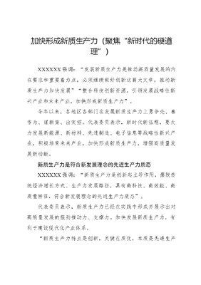 加快形成新质生产力(聚焦新时代的硬道理)XXXXXX强调:发展新质生产力是推动高质量发展的内在要求和重要着力点,必须继续做好创新这篇大文章,推动新质生产力加快发展整合科技创新资源,引领发展战略性新兴产业和未来产业,加快形成新质生产力。今年以来,各地区各部门在发展新质生产力上勇争先、善作为、谋新策、出实招。代表委员表示,新时代新征程,要大力发展新能源、新材料、先进制造、电子信息等战略性新兴产业,积极培育未来产业,加快形成新质生产力,增强高质量发展新动能。新质生产力是符合新发展理念的先进生产力质态XXXXXX强调:新质生产力是创新起主导作用,摆脱传统经济增长方式、生产力发展路径,具有高科技、高效能、高质量特征,符合新发展理念的先进生产力质态。代表委员表示,新质生产力已经在实践中形成并展示出对高质量发展的强劲推动力、支撑力。加快发展新质生产力,有利于建设现代化产业体系。新质生产力特点是创新,关键在质优,本质是先进生产力,对于加快建设现代化产业体系具有重要意义。通用技术集团党组书记、董事长于旭波代表说,通用技术集团与重庆理工大学共同推进纳米时栅技术产业化,广泛应用于高档数控机床、机器人领域,助力国内高端装备产业发展。中国科学院院士赵宇亮委员表示,加快发展新质生产力,有利于建设具有完整性、先进性、安全性的现代化产业体系。加快形成新质生产力,打造经济增长新引擎。2023年,我国新能源汽车产量达944.3万辆,比上年增长30.3%;太阳能电池(光伏电池)产量达5.4亿千瓦,增长54.0%;服务机器人产量783.3万套,增长23.3%。发展新质生产力,既有利于培育发展一批产业规模大、带动能力强的支柱产业,也有利于加快传统产业转型升级,增强我国经济发展韧性,推动经济实现质的有效提升和量的合理增长。中山大学党委副书记、校长高松代表说。2023年,我国高技术制造业增加值增长2.7%,高技术产业投资比上年增长10.3%,新动能不断积蓄。中国铁道建筑集团有限公司党委书记、董事长戴和根委员表示,新质生产力由技术革命性突破、生产要素创新性配置、产业深度转型升级而催生,以劳动者、劳动资料、劳动对象及文可居文库——海量学习资料,手机电脑均可下载www.wenkeju.com其优化组合的跃升为基本内涵,以全要素生产率大幅提升为核心标志。加快形成新质生产力,有利于塑造国际竞争新优势。当前,新一轮科技革命和产业变革深入发展,科技创新是重中之重。中国工程院院士、鹏城实验室主任高文代表说,哪个国家拥有先进科学技术,拥有处于世界领先地位的战略性新兴产业和未来产业,哪个国家就更有可能赢得发展主动权。高松代表表示,中国式现代化关键在科技现代化,要把握好新一轮科技革命和产业变革带来的巨大机遇,加快形成新质生产力,打造新优势。科技创新是发展新质生产力的核心要素XXXXXX指出:科技创新能够催生新产业、新模式、新动能,是发展新质生产力的核心要素。代表委员表示,必须加强科技创新特别是原创性、颠覆性科技创新,加快实现高水平科技自立自强,打好关键核心技术攻坚战,培育发展新质生产力的新动能。加快原创性、颠覆性科技创新,培育发展新质生产力的强劲动能。发展新质生产力,需要依靠从0到1的科技创新,通文可居文库——海量学习资料,手机电脑均可下载www.wenkeju.com过原创性、颠覆性、前沿性的技术突破,打造高质量发展的动力引擎。于旭波代表说,2023年,我国全年研究与试验发展(R&D)经费支出33278亿元,比上年增长8.1%。中央企业要进一步发挥创新主体作用,营造积极进取的科技创新环境,鼓励更多原创性、颠覆性科技创新。新一代人工智能、生命科学等新技术快速发展,将加速重塑全球产业链供应链格局,深刻改变世界各国的比较优势和竞争优势。高松代表表示,应该瞄准世界科技前沿,真正把论文写在祖国大地上,把科技成果应用在推动高质量发展中。深化体制机制改革,打通束缚新质生产力发展的堵点卡点。发展新质生产力,必须进一步全面深化改革,形成与之相适应的新型生产关系。赵宇亮委员说,要充分发挥科技创新成果产业化平台的引领作用,加强科技创新成果的产业化转化,将科技创新成果转化为新质生产力。国机重型装备集团股份有限公司党委书记、董事长韩晓军代表建议,要通过优化重大技术装备首台套及首批次材料研制支持政策,支持行业头部企业搭建中试平台,创新生产要素配置方式,让各类先进优质生产要素向发展新质生产力顺畅流动。打造新型劳动者队伍,夯实发展新质生产力的人才基础。文可居文库——海量学习资料,手机电脑均可下载www.wenkeju.com加快发展新质生产力,应着力夯实人才基础,拿出真金白银、真招实策、真心实意,引才聚才用才留才。内蒙古自治区鄂尔多斯市