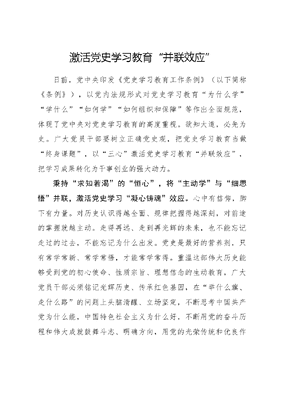 激活党史学习教育并联效应日前,党中央印发《党史学习教育工作条例》(以下简称《条例》),以党内法规形式对党史学习教育为什么学学什么如何学如何组织和保障等作出全面规范,体现了党中央对党史学习教育的高度重视。欲知大道,必先为史。广大党员干部要树立正确党史观,把党史学习教育当做终身课题,以三心激活党史学习教育并联效应,把学习成果转化为干事创业的强大动力。秉持求知若渴的恒心,将主动学与细思悟并联,激活党史学习凝心铸魂效应。心中有信仰,脚下有力量。对历史认识得越全面、规律把握得越深刻,对前途的掌握就越主动。走得再远、走到再光辉的未来,也不能忘记走过的过去,不能忘记为什么出发。党史是最好的营养剂,只有常学常新、常学常悟,才能常学常得。重温这部伟大历史能够受到党的初心使命、性质宗旨、理想信念的生动教育,广大党员干部必须铭记光辉历史、传承红色基因,在举什么旗、走什么路的问题上头脑清醒、立场坚定,不断思考中国共产党为什么能,中国特色社会主义为什么好,不断用党的奋斗历程和伟大成就鼓舞斗志、明确方向,用党的光荣传统和优良作风坚定信念、凝聚力量,用党的实践创造和历史经验启迪智慧、砥砺品格。要以党的旗帜为旗帜,以党的方向为方向,以党的意志为意志,不断在知之愈明中站稳政治立场,增强历史定力,不断从党的伟大历史中汲取强大的信仰力量。永葆入木三分的专心,将学经验与明路径并联,激活党史学习解题破难效应。学史以明智,鉴往而知来。我们学习历史是为了总结历史经验、把握历史规律,增强开拓前进的勇气和力量。党的经验不是从天上掉下来的,也不是从书本上抄来的,而是我们党在历经艰辛、饱经风雨的长期摸索中积累下来的,饱含着成败得失,凝结着鲜血汗水,充满着智慧力量。只有自觉学习认识党在革命、建设、改革各个历史时期创造的丰富经验、总结的历史规律,把党的历史学习好、总结好,把党的成功经验传承好、发扬好,才能弄明白未来我们怎样才能继续成功。立足新起点、阔步新征程,广大党员干部要总结运用党在不同历史时期防范化解风险挑战的丰富经验,把学到的知识、掌握的规律,转化为解决发展问题、应对风险挑战的能力,转化为锐意进取、担当实干的精气神,不断提高把握新发展阶段、贯彻新发展理念、构建新发展格局的政治能力、战略眼光、专业水平,更有智慧地在中国式现代化道路上坚定不移走下去。文可居文库——海量学习资料,手机电脑均可下载www.wenkeju.com涵养锲而不舍的决心,将下真功与办实事并联,激活党史学习知行合一效应。往昔已展千重锦,明朝更进百尺竿。历史向我们展示了共产党人改天换地的行动伟力,同时也启示我们,前进道路上不可能一直平坦,愈加需要发扬知行合一的实干精神。党史学习教育在先,学以致用为果。广大党员干部要带着对事业的强烈责任用党史经验,把党史学习教育成效转化为干事创业的动力、举措和成效。要把党的性质宗旨、初心使命的学习教育,与真心实意地谋创新、促发展统一于一体,与满腔热忱地为群众办实事、解难事联系在一起,与增强人民在改革发展中的获得感、幸福感、安全感贯通于一处,把为民造福作为最大的政绩,要深深扎根于人民、始终依靠人民、不断用拼搏奉献温暖百姓之心。实现中华民族伟大复兴,需要一代又一代人接续奋斗。我们这一代人必须接过接力棒,扛起使命担当,在学与做、知与行的统一中开拓进取、笃行不怠,用持之以恒的努力创造实实在在的业绩,不断书写新的时代篇章。文可居文库——海量学习资料,手机电脑均可下载www.wenkeju.com