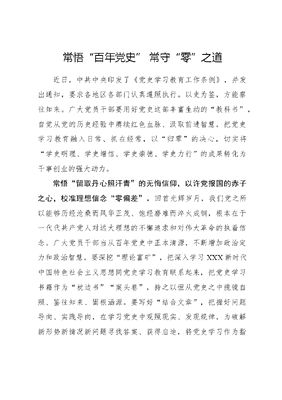 常悟百年党史 常守零之道近日,中共中央印发了《党史学习教育工作条例》,并发出通知,要求各地区各部门认真遵照执行。以史为鉴,方能察往知来。广大党员干部要用好党史这部丰富生动的教科书,自觉从党的历史经验中赓续红色血脉、汲取前进智慧,把党史学习教育融入日常、抓在经常,以归零的决心,切实将学史明理、学史增信、学史崇德、学史力行的成果转化为干事创业的强大动力。常悟留取丹心照汗青的无悔信仰,以许党报国的赤子之心,校准理想信念零偏差。回首光辉岁月,我们党之所以能够历经沧桑而风华正茂、饱经磨难而淬火成钢,根本在于一代代共产党人对远大理想的不懈追求和对伟大革命的执着信念。广大党员干部当从百年党史中正本清源,不断增加政治定力和政治智慧。要深挖理论富矿,把深入学习XXX新时代中国特色社会主义思想同党史学习教育联系起来,把党史学习书籍作为枕边书案头卷,持之以恒从党史之中揽镜自照、鉴往知来、固根涵源。要写好结合文章,把握好问题导向、实践导向,在学习党史中观照现实、发现规律,为破解新形势新情况新问题寻找答案、获得启迪,将党史学习作为指导实践的引路明灯。崇高信仰之坚定绝非一日之功,当常修常炼、常悟常进,方能做到无论顺境逆境都始终坚韧不拔、坚定不移、坚贞不渝,自觉做共产主义远大理想、中国特色社会主义共同理想的坚定信仰者和忠实践行者。常悟俯首甘为孺子牛的初心使命,以枝叶关情的公仆之姿,保障为民服务零温差。XXXXXX强调,我们党的百年奋斗史就是一部为人民谋幸福的历史,一部践行党的初心使命的历史,一部党与人民心连心、同呼吸、共命运的历史。从革命年代湖南沙洲的半条被子,到建设时期河南兰考的焦桐叶茂,再到脱贫路上广西百色大山的女儿……一代代共产党人始终牢记,我们党的根基在人民、血脉在人民、力量在人民。广大党员干部当从百年党史中寻根守魂,厚植人民情怀,走好群众路线,始终将人民呼声作为第一号令,将人民需求作为第一选择,将人民满意作为第一标准。扎根群众之间、关心急难愁盼、迈稳为民步伐,积极践行四下基层工作制度,问需于民、问计于民、问效于民,用心用情用力为群众纾困解忧,把群众的烦心事变成暖心事,把群众的忧心事变成贴心事,让民生获得感成色更足、群众幸福感更可持续。常悟千难万险何所惧的勇毅担当,以踔厉奋发的实干文可居文库——海量学习资料,手机电脑均可下载www.wenkeju.com之力,坚持践履笃行零时差。从建党时的开天辟地,到新中国成立的改天换地,到改革开放的翻天覆地,再到党的十八大以来党和国家事业取得历史性成就、发生历史性变革,我们党于百年峥嵘、栉风沐雨中书写了一个个彪炳史册的传奇。时代催人奋进,使命呼唤担当,唯有矢志不渝、笃行不怠,方能不负时代、不负人民。广大党员干部当从百年党史中养气聚力,从伟大胜利中总结宝贵经验,从弯路挫折中吸取经验教训,发扬革命先辈艰苦奋斗精神,主动奔赴乡村振兴第一线、急难险重最前沿,在爬坡过坎、跋山涉水中找寻新规律、探索新路径、凝聚新动力,在化解矛盾、解决问题中不断练筋骨、持续强本领、奋力长才干。勇当敢为人先的头雁,揭榜挂帅的闯将,攻城拔寨的尖兵,多施远策、务求实功,以行百里者半九十的清醒坚定,在伟大新征程上创造时代新奇迹。文可居文库——海量学习资料,手机电脑均可下载www.wenkeju.com