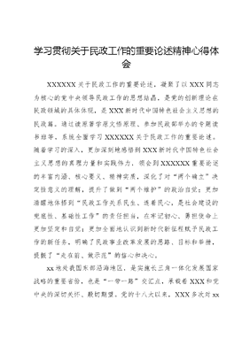 学习贯彻关于民政工作的重要论述精神心得体会XXXXXX关于民政工作的重要论述,凝聚了以XXX同志为核心的党中央领导民政工作的思想结晶,是党的创新理论在民政领域的具体体现,是XXX新时代中国特色社会主义思想的民政篇。通过读原著学原文悟原理、参加民政部举办的专题读书班等,系统全面学习XXXXXX关于民政工作的重要论述。随着学习的深入,更加深刻地感悟到XXX新时代中国特色社会主义思想的真理力量和实践伟力,领会到XXXXXX重要论述的丰富内涵、核心要义、精神实质,深化了对两个确立决定性意义的理解,提升了做到两个维护的政治自觉;更加清醒地体悟到民政工作关系民生、连着民心,是社会建设的兜底性、基础性工作的责任担当,在牢记初心、勇担使命上更加坚定和自觉;更加全面地认识到新时代新征程赋予民政工作的新任务,明确了民政事业改革发展的思路、目标和举措,提振了走在前、做示范的信心和决心。xx地处我国东部沿海地区,是实施长三角一体化发展国家战略的重要省份,也是一带一路交汇点,承载着XXX和党中央的深切关怀、殷切期望。党的十八大以来,XXX多次对xx工作作出重要指示,为xx发展指航定向。2023年3月,XXX参加十四届全国人大一次会议xx代表团审议并发表重要讲话;XXX2023年7月到xx考察和12月到xx考察,为推进中国式现代化xx新实践作出战略指引、注入强劲动力。XXX明确要求xx必须在保障和改善民生、推进社会治理现代化上走在前列,对民政工作提出了新的更高期望,我们倍感使命光荣、责任重大。新征程是充满光荣和梦想的远征,没有捷径,唯有实干。xx民政系统学习贯彻XXXXXX关于民政工作的重要论述,就是要坚守民政工作的政治属性,坚定捍卫两个确立,坚决做到两个维护,始终在思想上政治上行动上同以XXX同志为核心的党中央保持高度一致;就是要牢记XXX殷殷嘱托,强化走在前、做示范的使命意识,深化民政事业改革发展,实现服务理念更先进、服务范围更全面、服务内容更丰富、服务方式更主动、服务手段更现代化;就是要服务党和国家事业发展全局,主动对接推进国家治理体系和治理能力现代化、积极应对人口老龄化、促进共同富裕、推动乡村全面振兴、长三角一体化发展等国家战略和重要部署,明确工作定位,履行部门职责,充分发挥民政工作的兜底夯基功能;就是要践行以人民为中心的发展思想,站稳群众立场,厚植为民情怀,认真履文可居文库——海量学习资料,手机电脑均可下载www.wenkeju.com行基本民生保障、基层社会治理、基本社会服务职能,努力增进群众的获得感、幸福感和满意度。强化基本民生保障,助力共同富裕XXXXXX十分关心困难群体生活,明确指出对困难群众要格外关注、格外关爱、格外关心;强调要兜住底、兜准底、兜好底;要求深化社会救助制度改革,形成覆盖全面、分层分类、综合高效的社会救助格局。xx已全面建立x+x社会救助制度体系,当前共保障城乡低保对象xx万户、xx.x万人,城乡特困人员xx万人,全省低保平均标准达每人每月xxx元;残疾人两项补贴分别惠及xx万人和xx万人。下一步,要坚持尽力而为、量力而行,以兜底线、保基本、促发展为目标,在扩围、提质、增效上下功夫,建立健全分层分类、更有温情、更富质效的社会救助体系,整体提升基本民生保障水平。要系统化推进社会救助体系建设,完善分层的对象认定体系,适度有序扩大保障范围,确保应保尽保;构建分类的救助政策体系,区分不同致困原因和困难程度,实施更有针对性的救助,实现精准救助;健全科学的标准调整机制,既考虑困难群众生活水平的稳步提升,又考虑公共财政的可承受力,努力实现可持续发展。要多元化提升救助服务温度,统筹推进物文可居文库——海量学习资料,手机电脑均可下载www.wenkeju.com质+服务综合救助,更好满足困难群众的个性化需求;积极推进政府主导+社会参与,充分发挥慈善在第三次分配中的重要作用,实现政府救助和慈善救助的衔接补充;大力发展常态救助+应急救助,高度关注临时遇困群体,充分用好临时救助政策,有效帮助困难群众走出困境。要智慧化增强救助工作能力,统筹用好基层社会救助机构、社工站、专业社会组织力量,充实工作队伍;优化救助申办流程,用好x易助等智慧救助平台,提高困难群众求助的便捷性;健全主动发现机制,建立预警平台,及时发现困难对象,提高救助的时效性。完善基本社会服务,提高生活品质在我国已全面建成小康社会的背景下,民政部门在强化基本民生保障的同时,还应持续加大养老、儿童、婚姻、殡葬等基本社会服务的供给,提升服务均等化、规范化、可及性。尤其是一老一小问题,XXX高度重视,这本质上是人口老龄化问题的两个方面,要求我们从整体的视角、从全龄人口和全生命周期的视域,落实积极应对人口老龄