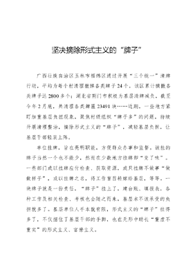 坚决摘除形式主义的牌子广西壮族自治区玉林市福绵区通过开展三个统一清牌行动,平均为每个村清理撤掉各类牌子24个,该区累计摘撤各类牌子达2800多个;湖北省荆门市积极为基层清牌减负,截至今年2月底,共清理各类牌匾23491块……近期,一些地方紧盯加重基层负担现象,聚焦村级组织牌子多的问题,持续开展清理整治,摘除形式主义的牌子,减轻基层负担,让基层干部轻装上阵。单位挂牌,旨在亮明职能,方便群众办事和监督。该挂的牌子当然一个也不能少,然而在少数地方挂牌却变了味。一些部门或以挂牌应付检查、获取资源,或只挂牌不做事做做样子,或以挂牌之名,将工作盲目转嫁给基层,等等。一块牌子就是一份责任,牌子挂上了,建台账、填报表,各种工作及相关检查、考核也会随之而来,基层本不该承受的负担就多了。基层单位人手本就有限,形式主义的牌子挂得多了,不仅捆住了基层干部的手脚,也在无形中助长重虚不重实的形式主义、官僚主义。有形的牌子好摘,心中无形的杂念难除。注重表面治理,忽视源头防范,形式主义还会不断滋生新变种,基层的负担就减不下来,工作效能就提不上去。有的认为牌子上墙了,会议召开了,才体现重视;有的认为牌子挂了,文件发下去了,工作就算干了;有的重留痕轻实绩,设置种种不科学的台账、考核指标……形式主义的根源在于思想认识,通过清牌减负,不仅要摘掉有形的牌子,更要清除深藏的错误思想认识、私心杂念。部分领导干部作风不实,政绩观错位,不顾基层工作人员实际情况,只挂牌不干事、重留痕轻留心、要声势不重效果,导致形式主义问题纠而不绝。各级领导干部要坚持实事求是,把为民造福作为最大政绩,切实把对上负责与对下负责统一起来,对准基层干部的累点痛点,从一文一会抓起,从一人一事改起,让减负真正减到干部群众心坎上。各级纪检监察机关要紧盯影响党中央决策部署落实落地、影响高质量发展的不作为乱作为、加重基层负担等现象从严监督执纪,以钉钉子精神持续纠治形式主义、官僚主义,让基层干部回归干事创业本位。牌子减下来,服务提上去。基层是国家治理的最末端、服务群众的最前沿,是贯彻落实党中央决策部署的最后一公文可居文库——海量学习资料,手机电脑均可下载www.wenkeju.com里。不必要的负担减下来了,就要聚焦重点、真心实意为群众办好事。基层党员干部要坚持出实招、办实事、求实效,将更多时间和精力投入到解决实际问题上,不折不扣、敢作善为抓好各项惠民政策落实,让好政策真正惠及群众,让群众的笑脸更加灿烂,切实做到减牌不减质量、减负不减服务。文可居文库——海量学习资料,手机电脑均可下载www.wenkeju.com