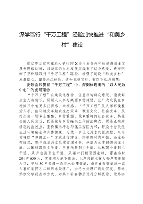 深学笃行千万工程经验加快推进和美乡村建设通过参加这次在浙大举行的X县乡村振兴和经济高质量发展专题培训班,对浙江的乡村发展实践有了切身感受,进而明晰了王桥镇践行千万工程路径,增强了建设和美乡村发展信心。借鉴浙江经验,结合我镇实际,有以下几点感想:要领会和贯彻千万工程中、深刻体现出的以人民为中心的发展理念千万工程在建设过程中,注重征询群众意见,激发群众主人翁意识,引领人人参与美丽乡村建设,让广大农民在乡村振兴中有更多获得感、幸福感。千万工程从人居环境整治入手,由环境变革触发生态变革,激发文化、社会变革,从而形成一场乡土重整、乡村重塑、城乡重构的社会变革,其蕴含的人民立场,既是做好乡村振兴工作的落脚点,更是正确政绩观的出发点。王桥镇米坪村与化工园区为邻,群众十分关注生活环境安全和身体健康,为进一步优化污水处理流程,米坪村将以多路汇一方式进行建设,即根据村内户数、企业分布情况,集中规划污水处理管道6条,分别为从幸福路到主干道、从团结路到主干道、从富民路到主干道、从林荫小道到主干道、从产业路至主干道、从第一门楼至烈士碑,覆盖全村204户650人,管道均为地下铺设,以户内排水管为每户管道接入口,平均50户共用一条污水处理管道,最终6条管道统一汇入襄矿集团乙二醇污水处理厂,由污水处理厂通过沉淀、筛选、添加化学药剂等方式,对其中有害物质进行分解提取,最终实现污水排放零污染,形成群众支持属地企业,企业服务属地群众共赢局面。要领会和贯彻千万工程中、深刻体现出的一切从实际出发的发展理念我们要学习千万工程的求实作风,坚持实事求是,办实事、做实功、出实招、求实效。王桥镇米坪村要依托周边企业,深入发展设施农业、劳保用品加工、金属网制品加工等,打破简单的靠山吃山,强化市场意识、紧盯市场需求,建立经营灵活、管理有效、运行稳健的集体经济发展机制,鼓励以出租、入股经营等方式盘活利用农村资源资产,培育更多市场活力旺、联农带农能力强的经营主体,让群众获得更稳定更可持续的收入。全面推进厕所、垃圾、污水三大革命,进一步做好基础设施建设、公共服务提升、村庄绿化美化等,建立村容村貌长效管护机制,推动乡村生产方式、生活方式、治理方式变革。米坪村根据村内人口分布情况与房屋基础情况不同,将村内划分为3个类型梯次落实厕所革命工作。第一类共65户,实现单元楼式厕所安装运行,配备淋浴、花洒等洗澡设备,让村民在农村享受城市便捷。第二类共25户,实现厕所进入户内东西厢房,成为东西厢房的一部分,有效减少污染。第三类共114户,严格落实厕所革命举措,马桶替换旱厕,保持干净整洁环境卫生。同时,村内所有住户门前种植由村级统一规划实施,在不同区域展现不同的米坪风采。要领会和贯彻千万工程中、深刻体现出的功成不必在我的责任担当浙江千万工程20年的实践发展,每一个阶段都随着群众需求升级而发展。千万工程是基础工程、龙头工程、生态工程、民心工程,为基层治理提供了很好的系统理论和方法,那就是坚持从实际出发想问题、做决策、办事情。认准目标,一任接着一任干、一锤接着一锤敲,久久为功,看得见、摸得着的幸福感一点点累积起来,充分体现了功成不必在我的文可居文库——海量学习资料,手机电脑均可下载www.wenkeju.com政绩观和功成必定有我的责任担当。具体工作中,米坪村制定五年发展规划,围绕村内一路六巷开展交通路网建设。主干道长3000米,西连五西线,东至米坪村人民英雄纪念碑,均为柏油马路,本年度主干道两侧增设太阳能光伏发电板,完成对主干道两侧人行道路的修缮维护约1500米。以村中主干道为核心,批次建设幸福路、富民路、团结路等6条巷道以及18条入户道路,其中幸福路总长300米、富民路总长300米、团结路总长900米、教育路连接主干道与幼儿园、小学、产业路总长600米,连接光伏发电、豆豆乐食品加工厂、米坪瑞福农牧肉驴养殖场等产业,通向米坪水库;打造一条林荫小道600余米,为百姓生活提供休闲场地,所有道路均进行铺油处理,以主干道向周边辐射,形成四通八达的交通路网。蓝图绘就后,要一年接着一年干,一任接着一任干,不朝三暮四,不急功近利,扎扎实实将规划变成现实。经过这次赴浙江大学学习培训和参观,我更加坚定了做好乡村振兴工作的信心,更进一步增强了王桥镇发展的紧迫感和责任感。在今后的工作中,我将反复思考、敢于创新、抢抓发展机遇,进一步解放思想、奋勇向前、埋头苦干,把学到的精神、经验和做法运用到具体工作中,为我县乡村振兴,为推进王桥镇和美乡村建设贡献自身力量! 文可居文库——海量学习资料,手机电脑均可下载www.wenkeju.com