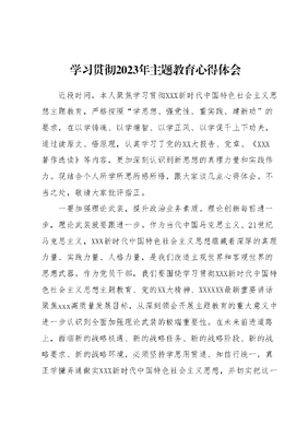 学习贯彻2023年主题教育心得体会近段时间,本人聚焦学习贯彻XXX新时代中国特色社会主义思想主题教育,严格按照学思想、强党性、重实践、建新功的要求,在以学铸魂、以学增智、以学正风、以学促干上下功夫,通过读原文、悟原理,认真学习了党的XX大报告、党章、《XXX著作选读》等内容,更加深刻认识到新思想的真理力量和实践伟力。现结合个人所学所思所感所悟,跟大家谈几点心得体会。不当之处,敬请大家批评指正。一要加强理论武装,提升政治业务素质。理论创新每前进一步,理论武装就要跟进一步。作为当代中国马克思主义、21世纪马克思主义,XXX新时代中国特色社会主义思想蕴藏着深厚的真理力量、实践力量、人格力量,是我们改造主观世界和客观世界的思想武器。作为党员干部,我们要围绕学习贯彻XXX新时代中国特色社会主义思想主题教育、党的XX大精神、XXXXXX最新重要讲话聚焦xxx高质量发展目标,从深刻领会开展主题教育的重大意义中进一步认识到全面加强理论武装的极端重要性。在未来前进道路上,面临新的战略机遇、新的战略任务、新的战略阶段、新的战略要求、新的战略环境,必须坚持学思用贯通、知信行统一,真正学懂弄通做实XXX新时代中国特色社会主义思想,并切实把这一思想转化为坚定理想、锤炼党性和指导实践、推动工作的强大力量,不断赢得优势、赢得主动、赢得未来。二要改进工作作风,求真务实开拓创新。党的十八大以来,以XXX同志为核心的党中央以前所未有的决心和力度冲破思想观念的束缚,突破利益固化的藩篱,坚决破除各方面体制机制弊端,各领域基础性制度框架基本确立,许多领域实现历史性变革、系统性重塑、整体性重构,全面深化改革取得历史性伟大成就。这充分说明,越是伟大的事业,越充满艰难险阻,越需要开拓创新。开拓创新是新时代中国特色社会主义不断前进的动力,只要我们顺应时代潮流,回应人民要求,勇于推进改革,准确识变、科学应变、主动求变,永不僵化、永不停滞,就一定能够创造出更多令人刮目相看的奇迹。我们需要始终保持革故鼎新、一往无前的勇气,这样的勇气可以推动我们克服困难,迎接挑战,实现目标。我们还需要始终葆有善于变革、敢于创新的锐气,这样的锐气能够帮助我们在变化的环境中找到新的机遇,创造新的解决方案,不断前行。更值得强调的是,我们要激扬闯的精神、创的劲头和干的作风。闯的精神让我们在面对困难时有勇气冲破束缚,突破难关;创的劲头启发我们在现有基础上寻求创新,追求卓越;而干的作风则鼓励我们实事求是,踏实工作,把握现在,创造未来。这些精神是我们前进的引路灯,带领我们向着明确的目标前行。三要强化纪律意识,严以律己正风肃纪。XXXXXX强调:必须做到政治过硬,牢固树立四个意识,在思想政治上讲政治立场、政治方向、政治原则、政治道路,在行动实践上讲维护党中央权威、执行党的政治路线、严格遵守党的政治纪律和政治规矩。作为纪检干部,我们要以《中国共产党章程》为根本遵循在规范制度下、边界内行使权力、开展工作,积极主动承担上级交办的急难险重任务,面对大是大非敢于亮剑,面对矛盾敢于迎难而上,面对失误敢于承担责任,面对歪风邪气敢于坚决斗争。要发挥自身职能作用,针对重要环节、重点领域开展专项监督,经常性开展纪律教育、警示教育,让广大党员干部自觉遵守各项规章制要坚持敢抓敢管,突出日常化经常化,加强对党章党规贯彻执行情况的监督检查,坚决维护好党章党规的权威性和严肃性推进全面从严治党向纵深迈进。