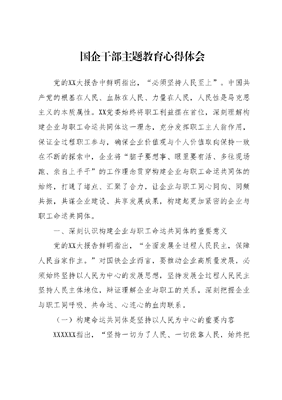 国企干部主题教育心得体会党的XX大报告中鲜明指出,必须坚持人民至上。中国共产党的根基在人民、血脉在人民、力量在人民,人民性是马克思主义的本质属性。XX党委始终将职工利益摆在首位,深刻理解构建企业与职工命运共同体这一理念,充分发挥职工主人翁作用,保证全过程职工参与,确保企业价值观与个人价值取向保持一致在不断的探索中,企业将脑子要想事、眼里要有活、多往现场跑、亲自上手干的工作理念贯穿构建企业与职工命运共同体的始终,打通了堵点、汇聚了合力,让企业与职工同心同向、同频共振,共谋企业建设、共享发展成果,构建起更加紧密的企业与职工命运共同体。一、深刻认识构建企业与职工命运共同体的重要意义党的XX大报告鲜明指出,全面发展全过程人民民主,保障人民当家作主。对国铁企业而言,要推动企业高质量发展,必须始终坚持以人民为中心的发展思想,坚持发展全过程人民民主坚持人民主体地位,辩证理解企业与职工的关系,深刻把握企业与职工同呼吸、共命运、心连心的血肉联系。(一)构建命运共同体是坚持以人民为中心的重要内容XXXXXX指出,坚持一切为了人民、一切依靠人民,始终把人民放在心中最高位置。面对当前复杂形势和艰巨任务,国铁企业改革发展面临诸多风险和挑战,构建国铁企业与职工命运共同体是必然要求,也是构建人类命运共同体的有益探索和具体实践,更是国铁企业的奋斗目标,需要始终坚持以人民为中心的理念,始终站在贯彻落实XXX新时代中国特色社会主义思想的高度去想问题、办事情、抓工作。(二)构建命运共同体是中国铁路高质量发展的重要保障XXXXXX强调,国有企业是中国特色社会主义的重要物质基础和政治基础,是我们党执政兴国的重要支柱和依靠力量。这充分说明了国铁企业的政治属性。面对日新月异的改革发展要求国铁企业要兼顾服务社会和企业持续发展的双重目标,不断践行让旅客出行体验更美好的承诺,就必须准确把握命运共同体这一理念,建立企业与职工你中有我、我中有你的紧密联系,使企业和职工在思想认识上达到统一,进而增强时时放心不下的责任感和使命感,有效推动新时代铁路事业高质量发展。(三)构建命运共同体是凝聚工作合力的重要方式XX局集团公司领导干部会议深入分析了面临的严峻形势,深刻表明了经营工作在整体工作当中极为重要的地位。面对当前内外部环境,企业要追求效益最大化的目标,就必须在经营战略和策略上做出相应改变。要更加密切企业与职工的血肉联系,坚定实现强局富工目标的决心,用构建命运共同体的方式形成企业与职工同向发力、同频共振、相互促进、相得益彰的强大合力。二、深刻把握构建企业与职工命运共同体的基本要求构建企业与职工命运共同体,是贯彻落实XXX新时代中国特色社会主义思想的具体实践,是落实XXXXXX对国有企业改革发展新要求的主要途径,是推动国铁企业高质量发展的必然要求。对于国铁企业而言,要从人民铁路为人民的高度,把握命运共同体理念让企业和职工在思想认识上达到统一,建立相互依存、相互促进的命运共同体。构建企业与职工命运共同体,也是贯彻落实人民至上的要求,必须充分调动职工的积极性、主动性、创造性,最大程度发挥职工主人翁作用,充分激发广大职工的智慧和潜能,汇聚奋进新征程的磅礴力量,形成共谋企业建设、共享发展成果的良好氛围。构建企业与职工命运共同体必须找准切人点、发力点,从企业和职工最关心、最直接的利益人手,找到最大公约数、画出最大同心圆,树立共享共荣意识,不断提升职工对企业的满意度,进而增强职工的使命感、获得感、幸福感。(一)使命感是构建命运共同体的基础使命感是决定职工行为和思想的精神因素。强烈的使命感,是协调各方行动、实现和谐统一的精神基础,更是企业的灵魂,是广大职工的精神支柱、行为准则和动力源泉,是凝聚全体职工合力、提升攻坚克难能力的行动指南。(二)获得感是构建命运共同体的保证让企业成为成就职工的平台,营造有平台、有资源、有收获、有回报的良好氛围,有效增强职工的公平感和获得感,提高职工的满意度。企业为职工提供发展平台和利益保障的同时,也增强了职工的归属感和向心力。(三)幸福感是构建命运共同体的目标企业在自身取得发展的同时,要为职工提供成长成才的机会营造共治共享、命运与共的良好氛围,实现职工个人与岗位的最佳匹配,让企业成为职工实现人生价值的舞台,激发职工的积极性、创造性,增强职工的幸福感,从而推动企业和职工同步发展、共同成长。三、深入查摆制约构建企业与职工命运共同体的突出问题古语有云:不谋万世者,不足谋一时;不谋全局者,不足谋一域。充分说明,管理干部既要有全局视野,又要有过硬本领,这也是构建企业与职工命运共同体关键所在。面对构建命运共同体的迫切要求,还存在一些亟待解决的问题。(一)思维方式不合逻辑,在脑子要想事方面存在差距部分干部业务素质、综合能力不高