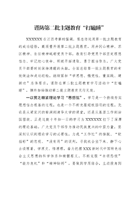 谨防第二批主题教育打瞌睡XXXXXX在江西考察时强调,要总结运用第一批主题教育的成功经验,高质量开展第二批主题教育,用井冈山精神、苏区精神、长征精神砥砺党员干部,教育引导党员干部坚定理想信念、牢记初心使命、积极开拓进取、勇于担当作为。广大党员干部要时刻保持清醒的头脑,全面总结第一批主题教育的有效做法和成功经验,继续紧扣学思想、强党性、重实践、建新功总体要求,谨防在第二批主题教育学习活动中打瞌睡,慎终如始推动第二批主题教育见行见效。一以贯之绷紧理论学习思想弦。学习是一个持续夯实理想信念根基的过程,也是一个不断克服短板弱项的过程。无论是从梁家河的窑洞到清华大学的课堂,还是从基层工作到治国理政,正是这数十年如一日的学习为XXXXXX打下了深厚的理论基础。广大党员干部作为推动民族复兴的中坚力量,要深刻认识到理论学习的必要性,力戒工作忙的推脱、软指标的忽视、没有用的误判,寻找机会坐下来、静下心去读原著、学原文、悟原理,着力把握XXX新时代中国特色社会主义思想的科学体系和精髓要义,不断克服本领恐慌能力危机和精神缺钙。要做到学用结合,主动投身到乡村振兴一线、改革攻坚前沿等地方,消化所学知识、提升认知水平,自觉围绕高质量发展缺什么、人民群众盼什么、党的建设要什么等内容,持续开展理论学习,把理论学习成果真正运用于提升人民利益、改善人民福祉。持之以恒苦练调查研究基本功。党的十八大以来,XXXXXX身体力行、率先垂范,从太行深处到黄土高原,从秦岭山间到蜀道深处……为全党重视调研、深入调研树立了光辉典范。没有调查就没有发言权,没有调查就没有决策权,广大党员干部要持之以恒锤炼好调查研究这一基本功,坚决摒弃走马观花式、蜻蜓点水式调研,做到以问题导向引领调研导向,以扎实的作风沉到火热基层一线、走进田间地头、走入群众家中把情况摸清摸透、把问题找准找全。要做好调查研究的后半篇文章,做到调后有研、研而用之,对调研所得材料去粗取精、去伪存真,把零散的认识系统化,把粗浅的结论深刻化,变都是问题为全是办法,真正做到研究一个问题解决一类问题,切实练好个人调研基本功,推动解决高质量发展面临的问题。坚持不懈打好检视整改组合拳。开展主题教育,检视整改是关键,问题检视的准确与否、整改整治的是否到位,直接反映出主题教育开展得深不深入。在第二批主题教育中,广大党员干部要做好同第一批主题教育衔接联动工作,继续打好检视整改组合拳,坚持边学习、边对照、边检视、边整改,做到敢于正视问题、善于发现问题,对照XXX新时代中国特色社会主义思想和党中央决策部署,深入查摆不足,工作和思想都要看、现象和实质都要查,把问题一个一个查出来,最终形成清晰明了的问题清单。要真发现、真整改,杜绝知而不改、改不彻底的形式主义做法,将当下改与长久立结合起来,建立管根本、利长远、重实效的长效机制,推动检视整改进一步走深走实。