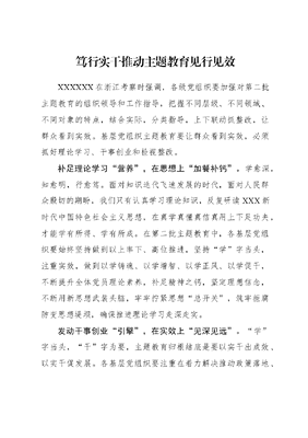 笃行实干推动主题教育见行见效XXXXXX在浙江考察时强调,各级党组织要加强对第二批主题教育的组织领导和工作指导,把握不同层级、不同领域、不同对象的特点,结合实际,分类指导,上下联动抓整改,让群众看到实效。基层党组织主题教育要让群众看到实效,必须抓好理论学习、干事创业和检视整改。补足理论学习营养,在思想上加餐补钙。学愈深,知愈明,行愈笃。面对知识迭代飞速发展的时代,面对人民群众殷切的期盼,我们只有认真学习理论知识,反复研读XXX新时代中国特色社会主义思想,在真学真懂真信真用上下足功夫,才能学有所得、学有所成。在第二批主题教育中,各基层党组织要始终坚持做到以上率下、高位推进,坚持学字当头,注重实效,做到以学铸魂、以学增智、以学正风、以学促干,不断提升全体党员理论素养,补足精神之钙,坚定理想信念,不断用新思想武装头脑,牢牢拧紧思想总开关,筑牢拒腐防变思想堤坝,确保推进理论学习走深走实。发动干事创业引擎,在实效上见深见远。学字当头,干字为要,主题教育归根结底是要以实干出成效、以实干促发展。各基层党组织要注重在着力解决推动政策落地、强化基层治理、为民办事服务、化解社会矛盾、建强基层组织等方面不断探索,引导党员干部立足岗位争创一流,激励担当作为,促进能力大提升、作风大转变。要聚焦巩固脱贫攻坚成果、加快乡村振兴、提高基层治理能力、提升服务群众质效等,结合调研走访收集的意见建议,根据实际开展提升一批基层组织、谋划一批发展项目、推动一批双基建设、办好一批民生实事、化解一批信访矛盾五个一活动,切实让群众感受到开展主题教育带来的变化。扬起检视整改船帆,在问题上对症下药。XXXXXX在主题教育工作会议上强调,要坚持边学习、边对照、边检视、边整改,把问题整改贯穿主题教育始终。敢于直面问题、勇于修正错误,是我们党的显著特点和优势,也是抓好学习贯彻XXX新时代中国特色社会主义思想主题教育的题中之义。各基层党组织要立足解决群众急难愁盼问题,深刻进行检视分析,找准查实问题短板,制定整改措施,逐项抓好整改,既要做好上题下答,根据上级党组织要求做好分类整改、专项整治有关工作,又促进下题上解,及时反映基层自身难以解决的问题。