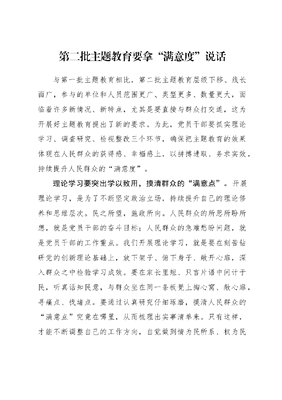 第二批主题教育要拿满意度说话与第一批主题教育相比,第二批主题教育层级下移、线长面广,参与的单位和人员范围更广、类型更多、数量更大,面临着许多新情况、新特点,尤其是要直接与群众打交道,这为开展好主题教育提出了新的要求。为此,党员干部要抓实理论学习、调查研究、检视整改三个环节,确保把主题教育的效果体现在人民群众的获得感、幸福感上,以拼搏进取、务求实效,持续提升人民群众的满意度。理论学习要突出学以致用,摸清群众的满意点。开展理论学习,是为了不断坚定政治立场,持续提升自己的理论修养和思维层次。民之所望,施政所向。人民群众的所思所盼所想,就是党员干部的奋斗目标;人民群众的急难愁盼问题,就是党员干部的工作重点。我们开展理论学习,就是要在刻苦钻研党的创新理论基础上,放下架子、俯下身子、敞开心扉,深入群众之中检验学习成效。要在家长里短、只言片语中问计于民,听真话知民意,与群众坐在同一条板凳上掏心窝、敞心扉,寻痛点、找堵点。要通过认真研究仔细琢磨,摸清人民群众的满意点究竟在哪里,从而梳理出实事清单来。只有这样,才能不断调整自己的工作方向,自觉做到情为民所系、权为民所用、利为民所谋。调查研究要涵养坚实作风,办妥群众的满意事。群众在想什么,群众需要什么,党员干部只有深入一线调查研究,才能得出结果,才能找到正确方法。只有把准群众的思想脉搏,了解群众的急难愁盼,才能把实事好事办到群众的心坎上。党员干部在开展调查研究时,要以扎实的作风一沉到底,如果只是雷声大雨点小甚至光打雷不下雨,搞些中看不中用的小把戏,那就是在糊弄群众,在做面子工程和形象工程,必将被人民群众识破和唾弃。党员干部务必一竿子插到底,敢钻矛盾窝,敢下深水区,在多接几次烫手的山芋、多当几回热锅上的蚂蚁中,经风雨、见世面、壮筋骨、长才干,才能办妥群众的满意事,以实际行动守住人民的心。检视整改要致力攻坚克难,提升群众的满意度。发现问题是为了更好地解决问题,只有把问题彻底整改,才能让群众看到实实在在的教育成效。党员干部要牢记江山就是人民,人民就是江山,时刻把群众的困难和需求放在心上、抓在手上。在检视整改中,要抓准事物的主要矛盾和矛盾的主要方面,以善于打七寸的过硬能力本领,把人民群众的操心事、烦心事、揪心事解决到位。要说干就干、干就干好,以逢山开路、遇水架桥的锐气,过了一山再登一峰、跨过一沟再越一壑。要力戒虚张声势,杜绝纸上谈兵,纠正遥控指挥,一锤接着一锤敲,一件接着一件干,以永葆初心、永担使命,久久为功、善作善成,持续提升群众的满意度,努力让人民群众的生活芝麻开花节节高。