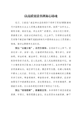 以高质量读书班凝心铸魂近日,云南省广南县举办县级领导干部学习贯彻XXX新时代中国特色社会主义思想主题教育读书班,按照自学为主、辅导为辅、做好交流、学出成果的要求,采取示范引领学、原著原文学、创新方式学的形式,以上率下,引领带动各级党员领导干部坚持不懈用XXX新时代中国特色社会主义思想凝心铸魂,推动主题教育走深走实。突出关键少数,示范引领学。县委班子以上率下,坚持先学一步、深学一层,以普通学员的身份,带头学习、深学细研,学出标准、做出样子,带动县人大常委会、县政府、县政协领导班子成员,县人民法院、县人民检察院党组书记,16个乡镇党委书记等50人参加读书班集中学习。各参学领导干部自觉提高站位,端正学习态度,摆正学员位置,在凝心铸魂筑牢根本上走在前、作示范,认真学习党中央批准确定的主题教育学习材料,带着感情学、带着使命学、带着问题学,在深学细照笃行中提高理论素养、坚定理想信念、升华觉悟境界、增强能力本领,为全县各级党员领导干部作出了示范。突出领悟理解,原著原文学。参学领导干部坚持把读原著、学原文、悟原理摆在首位,突出原原本本读原著、静下心来悟原理,按照统一时间、统一地点、统一考勤和端正学习态度、注重学习方法、提高学习效能、遵守学习纪律的要求,集中精力、心无旁骛研读党的XX大报告、党章、《XXX著作选读》《XXX新时代中国特色社会主义思想专题摘编》等主题教育8种学习资料,以优良学风推动全员参与、不落一人、不漏一课,真正学出坚定信念、学出绝对忠诚、学出使命担当、学出能力本领。并充分利用云岭先锋网共产党员网学习强国等平台,及时跟进学习XXXXXX在文化传承发展座谈会和广东、河北、陕西、四川等地考察时的重要讲话精神,全面学习领会XXX新时代中国特色社会主义思想的科学体系、核心要义和实践要求。突出消化吸收,创新方式学。一是上一堂思政党课。用好现有红色资源,让参学领导干部重温历史、赓续红色血脉,为参学领导干部上一堂以老山为主题的思政党课,更加深刻领悟艰苦奋战、无私奉献、不怕苦、不怕死、不怕亏的老山精神。二是开展一次专题辅导。邀请云南省委党校经济学教研部牛建宏教授围绕深入学习贯彻省委十一届四中全会精神,着力解难题、促发展、惠民生作专题辅导,为推动工业强县、农业稳县、文旅活县、人才兴县、依法治县提供有力指导。三是开展一次研讨发言。围绕建设世界的世外桃源乡村振兴示范县民族团结进步示范县三个定位,敞开思想、热烈讨论,深入交流、相互启发,努力从党的创新理论中找方向、找答案、找方法,达到了谈认识、找差距、明方向,把学习成效转化为推动落实的具体举措和解决问题的实际成效。