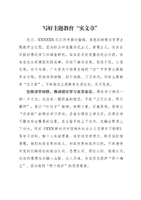 写好主题教育实文章近日,XXXXXX在江西考察时强调,要把实的要求贯穿主题教育全过程,坚决防止和克服形式主义、官僚主义,实实在在抓好理论学习和调查研究,实实在在检视整改突出问题,实实在在办好惠民利民实事,用实干推动发展、取信于民。大道至简,实干为要。广大党员干部要坚持把实字贯穿主题教育全过程,坚持深学细悟、躬行实践、刀刃向内,写好主题教育实文章,不断推动主题教育走深走实,见行见效。坚持深学细悟,推动理论学习走深走实。理论学习绝非一朝一夕之功,也没有一蹴而就的捷径,不能三天打鱼、两天晒网,要以钉钉子精神,铢积寸累,日就月将。要树立求实效的理论学习导向,妥善处理好工学关系,把理论学习摆在突出重要的位置,在全面系统上下功夫,在融会贯通上下功夫,用好《XXX新时代中国特色社会主义思想学习纲要》等学习材料,静下心来读原著、逐字逐句学原文、联系实际悟原理,做到知其言更知其义、知其然更知其所以然,不断增进对党的创新理论的政治认同、思想认同、理论认同、情感认同,切实把理想信念融入血脉、注入灵魂,夯实坚定拥护两个确立、坚决做到两个维护的思想根基。坚持躬行实践,推动调查研究求真唯实。知屋漏者在宇下,知政失者在草野。第二批主题教育层级下移、线长面广,同群众的联系更为紧密、问题导向更加直接,来不得半点形式主义,必须实之又实。要坚持目标导向和问题导向相结合,大兴务实之风,不搞作秀式、盆景式和蜻蜓点水式调研,聚焦社会发展的堵点难点和群众身边的急难愁盼问题,多走走自选路线,多找找盲点盲区,坚持眼睛始终向下看,脚步一直朝下走,自觉心向群众、沉下身来、深入基层,在脚沾泥土、挥洒热汗中把群众的意见反映上来,把工作存在的问题总结出来,并且提出符合实际情况的意见建议,全力以赴做实调查研究成果转化,真正发挥调查研究以研资政、以研辅政的作用。坚持刀刃向内,推动检视整改落细落实。抓好检视整改,既是主题教育的基本要求,也是取得实际成效的关键所在。要大力发扬刀刃向内的精神,把自己摆进去、把职责摆进去、把工作摆进去,勇敢面对、深刻剖析,对照党章党规、人民群众期盼等内容,通过自己找、上级点、群众提等方式,把对党忠诚、担当作为、服务群众等方面的差距和不足深刻检视出来。要坚持当下改与长久立有机结合,对于存在的问题做到不掩盖、不回避、不推脱,短期能够整改的,要立行立改、即知即改;反复性、长期性的问题,要明确目标,紧盯不放。对于检视整改过程中的好做法好经验,要及时以制度形式固定下来,切实把主题教育成果转化为推动高质量发展的强大动力。