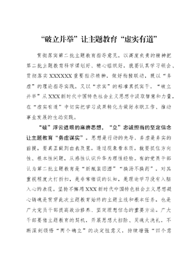破立并举让主题教育虚实有道贯彻落实第二批主题教育指导意见,以高度负责的精神把第二批主题教育科学谋划好、精心组织好,就要认真学习领会、贯彻落实XXXXXX重要指示精神,做好衔接联动,既以务虚的理论指导实践,又以求实的标准真抓实干,破立并举从XXX新时代中国特色社会主义思想中汲取智慧和力量,在虚实有道中切实把学习成果转化为做好本职工作、推动事业发展的生动实践。破浮云遮眼的麻痹思想,立忠诚担当的坚定信念让主题教育务虚谋实。思想是行动的先导,务虚是务实的前提,要真正做到由表及里,透过现象看本质,就要抓住方向性、根本性问题,从感性认识升华为理性经验。有的党员干部认为第二批主题教育是新瓶装旧酒换汤不换药,对其重视程度大打折扣,是非常错误的认知,是理论学习没有入脑入心的表现。坚持不懈用XXX新时代中国特色社会主义思想凝心铸魂是贯穿此次主题教育始终的主题主线和根本任务,也是广大党员干部提高政治修养、坚定理想信念的重要方法。广大干部要借主题教育的契机,开展思想大扫除、灵魂大洗礼,不断深刻领悟两个确立的决定性意义,持续增强四个意识、坚定四个自信、做到两个维护,不断增进对党的创新理论的政治认同、思想认同、理论认同、情感认同。破绠短汲深的本领恐慌,立能为善为的实干作风,让主题教育虚功实做。虚功实做是运用科学的理论方法指导工作实践的过程,但有的党员干部在面对新矛盾新挑战时存在新办法不会用,老办法不管用,硬办法不敢用,软办法不顶用的情况,极大地阻碍了工作质效的提升。对党员干部来讲,不论是新情况还是旧情况,不论是新问题还是老问题,要认识好、解决好,唯一的途径就是增强自己的本领。第二批主题教育更深入群众、更贴近基层,面对的问题和考验也更加复杂和严峻,广大干部要坚持一切从实际出发,牢牢把握主题教育基调,多在实效上用功、少在形式上费劲,不做表面文章、不搞随意翻新,把理论学习、调查研究同呼应群众需求、推动解决问题结合起来,实打实地研究提出思路办法和政策举措,以强化理论学习指导发展实践,以深化调查研究推动解决发展难题,成为用好理论的活字典、精通业务的政策通。破敷衍塞责的侥幸心理,立刀刃向内的检视精神,让主题教育虚实结合。为学之实,固在践履,务虚是务实的前提,务实是务虚的本质,唯有虚实结合,才能准确把握事物规律特点。推进主题教育走深走实,就要把检视整改摆在突出位置,勤于望闻问切、善于对症下药、做到标本兼治,以实际行动推动检视整改见行见效。有的干部面对调研过程中发现的问题,避重就轻、避实就虚、虚假整改,最终还是图穷匕见,躲得过初一,躲不过十五。聚焦重点问题,广大干部要时常对标对表,及时校正偏差,深刻检视剖析、深挖思想根源、深入整改落实,施行猛药去疴,重典治乱,防止大而化之、走马观花,既解决体肤顽疾、也剜除思想毒瘤,做到一针见血、直击要害,以整治成果彰显主题教育成效。