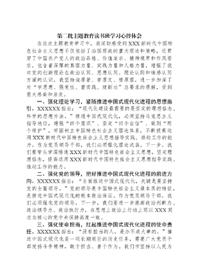 第二批主题教育读书班学习心得体会在这次主题教育学习中,我深切感受到XXX新时代中国特色社会主义思想不仅包括了治国理政的重大理论和策略,还贯穿了中国共产党人的政治品格、价值追求、精神境界和作风要求,包含着深厚的真理力量、实践力量和人格力量,增强了我对党的创新理论在政治认同、思想认同、理论认同和情感认同方面的认识。我坚持读原著、学原文、悟原理,进一步加深了对学思想、强党性、重实践、建新功总要求的理解,受到很大感染和启发。一、强化理论学习,紧随推进中国式现代化进程的思想指引。XXXXXX指出:现代化建设最需要的是坚定的理想信念、科学的思想方法。推进中国式现代化,必须坚持马克思主义指导地位,增强四个意识、坚定四个自信、做到两个维护,牢固树立中国特色社会主义理论体系,不断提高运用XXX新时代中国特色社会主义思想指导实践、推动工作的能力。作为党员领导干部,我们必须强化理论武装。下一步,我们要带头学深悟透XXX新时代中国特色社会主义思想,坚定理想信念,提高运用XXX新时代中国特色社会主义思想指导实践、推动工作的能力。二、强化党的领导,把好推进中国式现代化进程的前进方向。XXXXXX指出:全面推进中国式现代化,关键是要坚持党的全面领导。党的领导是中国特色社会主义最本质的特征,是推进中国式现代化的根本政治保证。作为党员领导干部,我们必须强化党的领导。下一步,我们要进一步提高政治判断力、政治领导力、政治执行力,在思想上政治上行动上同以XXX同志为核心的党中央保持高度一致。三、强化使命担当,扛起推进中国式现代化进程的使命责任。XXXXXX指出:没有担当的人,是办不成大事的。推进中国式现代化是一项长期艰巨的历史任务,需要广大党员干部发扬斗争精神,敢于担当、善于作为。我们市坚持以人民为中心的发展思想,勇于担当、真抓实干,抓住宁德打造全国生态文明建设示范区和全国现代化建设先行区的重大历史机遇,统筹疫情防控和经济社会发展,推动高质量发展,为全面建成社会主义现代化强国提供宁德经验。作为市长,我必须强化使命担当。下一步,我将进一步坚持问题导向,以钉钉子精神抓落实,以实际行动不负人民重托。四、强化队伍建设,构筑推进中国式现代化进程的坚强堡垒。XXXXXX指出:干部是决定因素。推进中国式现代化需要一支政治过硬、作风优良、能力出众的高素质专业化干部队伍。我们市深入贯彻新时代党的组织路线,坚持正确选人用人导向,通过组织上下联动、系统培养、分类使用,着力打造一支忠诚干净担当的高素质专业化干部队伍,为推进中国式现代化提供人才支撑和组织保证。作为副市长,我必须强化队伍建设。下一步,我将进一步关心爱护干部,严格管理监督干部,全面提高队伍建设质量,努力建设一支政治过硬、作风优良、能力出众的高素质专业化干部队伍。
