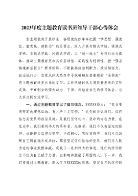 2023年度主题教育读书班领导干部心得体会自主题教育开展以来,各级党组织牢牢把握学思想、强党性、重实践、建新功的总要求,深入开展专题式学悟、课题式学研、主题式学践、问题式学改,以到一线去专项行动为载体,推动主题教育更加具有基础性、实践性与创新性。把强基铸魂彰显担当贯穿始终,不断提高政治判断力、政治领悟力、政治执行力,自觉从伟大思想中寻找破解发展难题的金钥匙将主题教育焕发出来的学习、工作热情转化为高质量发展的实际成效、干事创业的强大动力。下面,我结合自己的学习体会,与大家共同交流学习。一、通过主题教育学出了信仰信念。XXXXXX指出:党员要有坚定的理想信念,有共产主义信仰。这句话告诉我们,信仰信念是党员的政治灵魂,是我们坚守初心、使命的内在力量。在党史中,我们看到伟大的革命者、先驱者,他们不仅有坚定的信仰,还能够为信仰而坚守,不改初心。实际案例中,我们可以回顾自己所在地方或单位,那些坚定信仰信念的党员,他们为人民为党的事业默默奉献,成就了一系列伟大的事迹。他们的信仰信念不仅为自己赋予力量,也影响和激励了周围的人。下一步,我们要通过主题教育,深入学习XXXXXX的思想,坚定自己的信仰信念,牢记初心,坚持共产主义信仰。同时,要激发信仰的力量,积极参与和支持各项党的事业,为实现共产主义理想而努力奋斗二、通过主题教育学出了忠诚担当。XXXXXX强调:党员要忠诚老百姓,忠诚共产党。这句话告诉我们,忠诚担当是党员的核心素质,是我们在各种困难和挑战面前的坚强支持。在党史中,我们看到伟大的党员,他们无论在任何岗位,都忠诚履行自己的职责,无怨无悔。实际案例中,我们可以发现,那些具备忠诚担当精神的党员,无论在政府、企业、农村等各个领域,都取得了卓越的成绩。他们积极履行职责,为人民群众排忧解难,取得了人民的赞誉。下一步,我们要通过主题教育,加强对忠诚担当的培养和强化。在工作中,要坚守忠诚,担当责任,以实际行动服务人民,忠诚共产党,为党的事业捐躯奉献。三、通过主题教育学出了能力水平。XXXXXX提出:党员要不断提高自身的综合素质和工作水平。这句话告诉我们,能力水平是党员的重要品质,是我们在工作中的核心竞争力。党史中我们看到那些不断学习、不断提高能力的党员,他们在各个岗位上都表现出色。实际案例中,我们可以看到一些党员通过不断学习和提升能力,推动了地方或单位的发展。他们在各领域取得了显著成就,成为了本领域的佼佼者。下一步,我们要通过主题教育,重视自身能力水平的提升,积极学习新知识、新技能,不断提高综合素质和工作水平,为更好地服务人民、为党的事业贡献自己的力量。四、通过主题教育学出了干劲力量。XXXXXX指出:党员要保持高昂的干劲,保持旺盛的激情。这句话告诉我们,干劲力量是党员的生命力,是我们在工作中的不竭动力。在党史中,我们看到那些保持高昂干劲的党员,他们永不停歇,永不放弃。实际案例中,我们可以看到一些党员,无论遇到多大困难,都能够保持高昂的干劲,坚持奋斗,最终获得了成功。他们的干劲不仅激励自己,还鼓舞了身边的人。下一步,我们要通过主题教育,培养和激发自己的干劲力量,不畏艰难险阻,不气馁不放弃,坚持奋斗,为实现党的事业、人民的幸福而不懈努力。