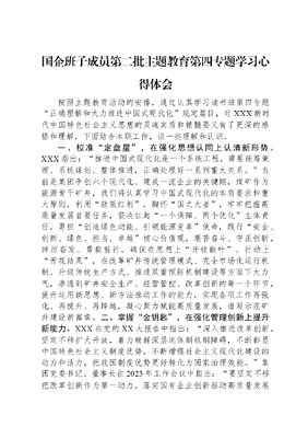 国企班子成员第二批主题教育第四专题学习心得体会按照主题教育活动的安排,通过认真学习读书班第四专题正确理解和大力推进中国式现代化规定篇目,对XXX新时代中国特色社会主义思想的灵魂实质和精髓要义有了更深的感悟和理解,下面结合本职工作,谈一些理解和认识。一、校准定盘星,在强化思想认同上认清新形势。XXX指出:推进中国式现代化是一个系统工程,需要统筹兼顾、系统谋划、整体推进,正确处理好一系列重大关系。当前是集团争创六个现代化、建成一流企业的关键期,煤矿作为能源骨干矿井,我们将认真学习中国式现代化的本质要求和重大原则,利用政策红利,胸怀国之大者,牢牢把握高质量发展首要任务,坚决扛起一个保障、两个优化主体责任,勇担创造绿色动能、引领能源变革使命,践行安全、创新、绿色、担当、卓越核心价值观,艰苦奋斗、守正创新,踔厉奋发、勇毅前行,确保在思想上开枝散叶、行动上开花结果,在改革矿井传统管理模式、完全市场化运行机制、升级传统生产方式、推进双重预防机制建设等方面下大力气,渗透到矿井安全生产、经营管控、改革创新的每一个环节,提升运用新思想、新方法推动工作的能力,实现各项工作再强化、再提升、再跨越,凝心聚力赋能高质量发展,谱写示范矿井建设新篇章。二、掌握金钥匙,在强化管理创新上提升新能力。XXX在党的XX大报告中指出:深入推进改革创新,坚定不移扩大开放,着力破解深层次体制机制障碍,不断彰显中国特色社会主义制度优势,不断增强社会主义现代化建设的动力和活力,把我国制度优势更好转化为国家治理效能。集团党委书记、董事长在2023年工作会议中指出:要坚定不移把改革创新作为第一动力。落实国有企业创新驱动高质量发展十条意见,深化现代企业制度、三项制度、市场化经营机制、混合所有制等全方位改革,实施科技研发、人力资源、数字转型等多领域创新,推动质量变革、效率变革、动力变革,持续提升企业核心竞争力。我们将深入贯彻实施五大创新攻坚工作部署,厚植企业核心竞争能力,在新一轮发展中抢占先机,开创高质量发展新局面。积极构建煤矿四用五促人才文化体系,实施1247人才发展规划,让事业激励人才,让人才成就事业,为矿井高质量发展提供坚实人才保障。坚持用活三大创效平台,发挥金点子银点子成果转化、双创劳模(技能大师)创新工作室三大创新平台作用,拓展创新创效广度和深度。全力推进智能化矿山建设,深化绿色矿山建设,打造绿色高效、低碳环保示范矿井。三、焕发精气神,在强化党建工作上务求新成效。中国式现代化是中国共产党领导的社会主义现代化,党的领导凝聚建设中国式现代化的磅礴力量。坚持党的领导、加强党的建设,是国有企业的光荣传统,是国有企业的根和魂。我们将树牢抓好党建是最大政绩理念,深推双入双创党建工作模式和兖矿新时代—融·创党建品牌落地,坚持党建工作与矿井中心工作紧密融合,以党建品牌为创新动力,秉持融创赋能同舟领航核心理念,推动党建工作全面加强、全面进步、全面过硬。以支部为点,以专业为线,创新载体、深化拓展,力争创建一批基层精品党建品牌,有序实现一支部、一特色、一品牌创建目标,把党建工作质效转化为推动矿井高质量发展的强劲动能。加大作风整治力度,以优良作风推动实践、以优良作风促进工作、以优良作风成就事业,积极营造干事创业、向上向善、公平公正良好氛围。创新培育企业文化品牌,提升全员的归属感、认同感、自豪感,增强助推矿井发展的软实力,聚力建设本质安全、生态优美、智能高效、人事相宜的现代化强企。实践发展永无止境,认识真理永无止境。在下一步工作中我们将以学习贯彻XXX新时代中国特色社会主义思想为引领,勇担中国式现代化新使命,持续推动主题教育见行见效,聚力赋能矿井高质量发展,谱写矿井建设新篇章。