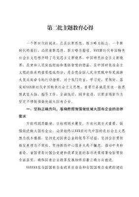 第二批主题教育心得一个新时代的到来,总是以新思想、新方略为标志,一个新时代的前行,必须有新思想、新方略为指引。XXX新时代中国特色社会主义思想开辟了马克思主义新境界、中国特色社会主义新境界,是党和人民实践经验和集体智慧的结晶,是中国特色社会主义理论体系的重要组成部分,是全党全国人民为实现中华民族伟大复兴而奋斗的行动指南。对于我们而言,学习好、贯彻好、落实好XXX新时代中国特色社会主义思想,首要任务就是用这一新思想武装头脑,指导工作,全面践行,阔步前进,以新业绩新作为坚定不移做强做优做大国有企业。一、坚持正确方向,准确把握做强做优做大国有企业的总体要求方向明则思路清,目标明则步履坚。方向问题至关重要,做强做优做大国有企业,必须始终以XXX新时代中国特色社会主义思想为根本遵循,坚持党对国有企业的领导不动摇、坚持全面贯彻新发展理念不放松、坚持围绕中心服务大局不懈怠,推动中央和省委、省国资委对国企党建和改革发展的各项决策部署全面贯彻全面落实,确保国有企业改革发展始终沿着正确方向前进。XXXXXX在全国国有企业改革座谈会和全国国有企业党的建设工作会上指出:国有企业是中国特色社会主义的重要物质基础和政治基础,要适应国内外经济形势发展变化,按照创新、协调、绿色、开放、共享发展理念的要求,提高经营管理水平,坚定不移把国有企业做强做优做大,不断增强活力、影响力、抗风险能力,实现国有资产保值增值。XXXXXX的系列重要论述,进一步丰富了中国特色社会主义政治经济学的理论内涵,深刻蕴含着国企改革发展的历史逻辑、理论逻辑和实践逻辑,具有极强的思想性战略性、理论性和指导性。我们要自觉深学、细悟、笃行,积极探索走出一条特色鲜明、行稳致远的国企高质量发展新路。二、坚持问题导向,增强做强做优做大国有企业的主动性和责任感XXX书记指出:深化国有企业改革,推动国有资本做强做优做大,培育具有全球竞争力的世界一流企业。高质量发展是全面建设社会主义现代化国家的首要任务,省属企业作为全省经济运行的顶梁柱,正成为山东提升核心竞争力的巨大推力近年来,公司发展较快,但资产总量、企业规模仍然偏小,发展质量不高,竞争力不强,企业困难较多,同质竞争突出等问题也不容忽视。要做强做优做大国有企业,必须坚持问题导向,努力破除改革发展中的瓶颈问题。要突出重点,抓住主要矛盾,及时发现、认真解决整合重组和改革发展中的突出困难和问题,做到不回避、不绕路,以问题的解决推进工作的进展。一方面要善于发现、及时梳理问题,把握主要方向,提出科学可行的解决方案,一方面要迅速处置、及时解决问题,更要群策群力,大力破解国有企业改革发展中的瓶颈问题,实现轻装上阵。三、坚持创新发展,增强国有企业经营活力和综合竞争力XXXXXX指出,创新是企业的动力之源。国企的经营活力和综合竞争力,归根结底来源于创新。只有坚持开放理念、市场导向创新发展,才能让国企经营活力迸发、综合竞争力倍增。做强做优做大国有企业要以理念创新推动全方位开放合作。推进国企改革发展,必须具有世界眼光、国际视野和互联网思维跳出体制、地域、行业局限,不仅要守好内部协同市场,还要谋求在更大范围、更高层次、更宽领域配置资源、运作市场,决不能固步自封、惯性思维,画地为牢、自娱自乐;坚持激励和约束并举、效率和公平并重,以落实企业内部自主分配权为重点,健全反映人力资本市场价位、与企业经济效益和个人绩效紧密挂钩体现岗位价值和业绩导向的员工薪酬体系;要以模式创新增强国有资本控制力、经营活力和综合竞争力。国企改革创新不能空转不能为改而改、维新而新,必须以提高国企的市场灵活性和适应性为重点,大力推进经营方式创新,扩大国有资本控制力、激发经营活力、提高综合竞争力;要积极学习践行XXX新时代中国特色社会主义思想,以此指导企业各项工作,始终坚持党的领导不断优化顶层设计,促进管理提质增效,坚定不移做强做优做大为续写集团高质量发展的绚丽篇章,为能源集团建设能源供应商和世界一流企业添砖加瓦。