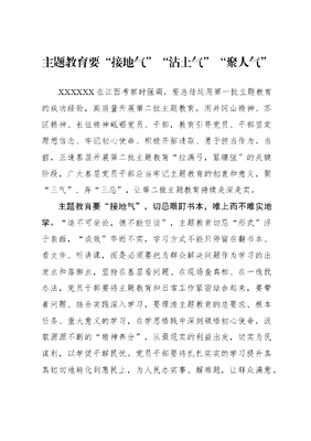 主题教育要接地气沾土气聚人气XXXXXX在江西考察时强调,要总结运用第一批主题教育的成功经验,高质量开展第二批主题教育,用井冈山精神、苏区精神、长征精神砥砺党员、干部,教育引导党员、干部坚定理想信念、牢记初心使命、积极开拓进取、勇于担当作为。当前,正逢基层开展第二批主题教育拉满弓,紧绷弦的关键阶段,广大基层党员干部应当牢记主题教育的初衷和意义,聚三气、弃三忌,让第二批主题教育持续走深走实。主题教育要接地气,切忌眼盯书本,唯上而不唯实地学。道不可坐论,德不能空谈,主题教育切忌形式浮于表面,成效华而不实,学习方式不能只停留在翻书本、看文件、听讲课,而是必须要把为群众解决问题作为学习的出发点和落脚点,坚持在基层看问题、在现场查真相、在一线找办法,党员干部要将主题教育和日常工作紧密结合起来,要带着问题、结合实践深入学习,要理清主题教育的总要求、根本任务、重大意义的学习,在学思悟践中深刻领悟初心使命,汲取源源不断的精神养分,从最现实的利益出发,切实为民谋利,以学促干解民忧。党员干部要将扎扎实实的学习提升真真切切地转化到惠民上,为人民办实事、解难题,让群众满意,这才是检验主题教育成效的最终标准。主题教育要沾土气,切忌闭关修炼,多理论无实践地学。纸上得来终觉浅,绝知此事要躬行,与第一批主题教育相比,第二批主题教育层级下移,线长面广,面对的问题和考验也更加复杂和严峻,群众期待解决的问题更具体。党员干部要敢于正视问题,迈开步子走出机关办公室,走进田埂地头,踏入群众家门,沉下身子,放下架子与群众同坐一条板凳,和人民群众说说知心话、聊聊烦心事,打破群众心墙,真诚倾听群众呼声、真实反映群众愿望、真情关心群众疾苦,准确把握群众的所忧所盼。走进群众中,把群众面临的问题挖掘出来、把群众反映的意见收集上来,身临其境感受,换个身份思考,确保把事情办在群众心坎上。只有实实在在找到解决办法,方能扎扎实实推进工作。主题教育要聚人气,切忌一叶障目,浅尝而不深入地学。要使主题教育走得深、走得实,必须要从七嘴八舌的家长里短中了解群众的所需、所盼、所怨,摸清工作的堵点淤点。切勿走马观花,通过一两个人、一两件事就下结论、写总结。党员干部要瞄准问题,要拿出刨根问底的认真劲、执着劲、拿出打破砂锅问到底的钻劲、一竿子插到底的韧劲,多走多问多调查、深入剖析问题症结、深挖问题根子。惟有走到底、走得深,依靠广泛的人民群众,才听得见群众呼声、看得到群众的急难愁办之事,掌握最真实的基层情况和民意。在学习中要坚持集思广益、注重群策群力,有条有理归类问题、分清问题,经过层层筛选,去伪存真、才能不被片面言辞蒙蔽,正确把握问题方向不偏航,主题教育才能取得实效。