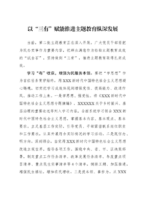 以三有赋能推进主题教育纵深发展当前,第二批主题教育正在深入开展,广大党员干部要把为民办实事作为重要内容,把群众满意作为检验主题教育成效的试金石,坚持做到三有,推进主题教育取得扎实成效。学习有收获,增强为民服务本领。要把学思想作为首位任务贯穿始终,用XXX新时代中国特色社会主义思想凝心铸魂,切实把学习成效体现到增强党性、提高能力、改进作风、推动工作上来。一是学思想、强党性。将《XXX新时代中国特色社会主义思想专题摘编》,XXXXXX关于乡村振兴、基层治理的重要论述等列入学习内容,全面系统学习领会XXX新时代中国特色社会主义思想,掌握基本内容、基本观点、基本要求。立足基层工作实际,引导党员、干部紧密联系岗位职责和工作要求,认真开展符合实际情况的学习活动。二是筑信念、明方向。深刻领会,自觉用XXX新时代中国特色社会主义思想改造主观世界,指导各项工作。围绕中央、省、市、区决策部署,制定重点工作任务清单、改革发展任务清单、年度重点项目清单、重点民生实事清单等4个清单,倒排工期、加压推进,增强民生福祉,增加农民增收。三是提本领、善作为。从XXX新时代中国特色社会主义思想中汲取奋发进取的智慧和力量,熟练掌握其中蕴含的领导方法、思想方法、工作方法,增强八项本领,提高七种能力,强化履职尽责水平,凝心聚力促发展,驰而不息抓落实,立足岗位作贡献。关切有回应,破解急难愁盼问题。要聚焦群众急难愁盼,引导党员干部回应群众需求,深入调研听民声、察民情,推动解决问题。一是问计于民,开展建言献策活动。调查研究要解决实际问题,应就群众关心关注的人居环境、土地流转、特色产业发展、农村自建房、农村基础设施完善、农田水利建设、丰富群众生活等方面入手,深入一线,与群众坐在一条板凳上,听取社情民意,掌握第一手资料,用民间智慧解决群众问题。二是身入心入,开展立足岗位作贡献活动。引导党员、干部在推动发展、基层治理、服务群众中主动作为、担当有为。紧扣中心工作和重点任务,通过设立党员示范岗党员责任区,组建党员突击队,开展承诺践诺,用好党员联户、干部包片、支部会商和积分管理、一编三定等载体,组织党员在重点项目、重大任务中发挥作用。三是党员联户,开展我为五星创建作贡献活动。民生无小事,枝叶总关情。引导党员干部冲在前、作表率,充分发挥先锋模范作用,开展承诺践诺、岗位练兵,设立党员示范岗、划定党员责任区,做到民呼我为接诉即办,从群众关心关切出发、从群众急难愁盼着手,尽心尽力解决群众生产生活中的堵点、难点、痛点问题。检视有整改,纠正脱离群众风险。以强有力的检视整改,推动解决问题,通过当下解决+限期整改的办法,使党员干部扑下身子、沉到一线,查不足、找差距、明方向,将问题清单转化为成效清单。一是扑下身子,奔着问题去。坚持目标导向和问题导向相统一,着力解决理论学习、政治素质、能力本领、担当作为、工作作风、廉洁自律6个方面突出问题,将主题教育与省委巡视、区委巡察工作相结合,刀刃向内,自我革命。二是主动作为,对着问题改。把每个问题都当作必答题,逐一研究、逐条剖析,细化分解成可操作、可落实、可评估的具体清单,责任到人、明确时限,重点解决执行、质量、效率等问题。三是走深走实,见行更见效。解决基层党员干部作风存在的突出问题,坚决依法依规解决群众合理诉求,切实维护群众利益。要对侵犯群众切身利益的行为及时查处,在规定时间内依法依规结案,做到件件有着落,案案有结果,实现打击一个、震慑一方、教育一片的扎实成效,切实维护群众利益。