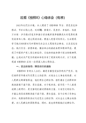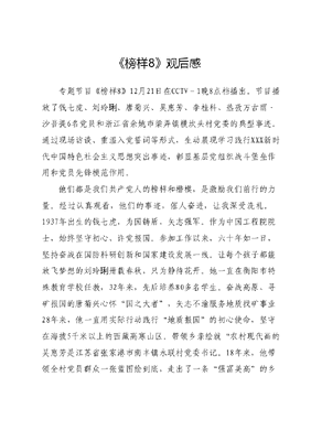 《榜样8》观后感专题节目《榜样8》12月21日在CCTV-1晚8点档播出。节目播放了钱七虎、刘玲、唐菊兴、吴惠芳、李桂科、热孜万古丽琍·沙吾提6名党员和浙江省余姚市梁弄镇横坎头村党委的典型事迹。通过现场访谈、重温入党誓词等形式,生动展现学习践行XXX新时代中国特色社会主义思想突出事迹,彰显基层党组织战斗堡垒作用和党员先锋模范作用。他们都是我们共产党人的榜样和楷模,是激励我们前行的力量。经过认真观看,他们的事迹,催人奋进,让我深受洗礼。1937年出生的钱七虎,为国铸盾,矢志强军。作为中国工程院院士,始终坚守初心、许党报国。参加工作以来,六十年如一日,坚持奋战在国防科研创新和国家建设发展一线。让每个孩子都能放飞梦想的刘玲卅载春秋,只为静待花开。她一直在衡阳市特琍殊教育学校任教,32年来,先后培养80多名学生。奋战高原、寻矿报国的唐菊兴心怀国之大者,矢志不渝服务地质找矿事业28年来,他一直用实际行动践行地质报国的初心使命,坚守在海拔5千米以上的西藏高寒山区。带领乡亲绘就农村现代画的吴惠芳是江苏省张家港市南丰镇永联村党委书记。18年来,他带领全村党员群众一张蓝图绘到底,走出了一条强富美高的乡村振兴之路,打造出了一个农业农村现代化的先行示范样本。抱着治病治心治贫让村民更幸福的李桂科倾心陪伴麻风康复者,他和同事们将山石屏和洋芋山两个麻风村的245名麻风病人全部治愈,让这两个地方彻底摘掉了麻风村的帽子。让居民生活像花儿一样的热孜万古丽·沙吾提是新疆乌鲁木齐经济技术开发区(头屯河区)钢城街道柯坪路北社区党委书记。她担任社区党组织书记20年,深入推动党建引领城市基层治理。坚持把支部建在小区上、小组落在楼栋里,将19名社区党员干部和131名居民党员混合编组,织密党建引领基层治理一张网。浙江省余姚市梁弄镇横坎头村党委深入践行XXXXXX重要回信精神,团结带领党员群众走出一条红色引领绿色发展之路,2021年村党委获评全国先进基层党组织,2022年实现村集体经济总收入366万元,农民人均可支配收入47108元。迈上新征程,建功新时代。作为党员干部要充分学习他们坚定信念、践行宗旨、拼搏奉献、廉洁奉公的高尚品质和精神风范在本职岗位上创先争优,力争上游,念好三字诀,交出一份人民满意的答卷。一是践行忠诚。内心有千磨万击还坚劲,任尔东西南北风的政治定力。政治忠诚是共产党人的基本政治伦理。第一要忠诚于党的信仰。马克思主义是共产党人的坚定信仰。第二要忠诚于党的组织。办好中国的事情,关键在党。第三,忠诚于党的理论和路线方针政策。只有掌握科学理论才能把握正确前进方向;只有立足实际、独立自主开辟前进道路,才能不断走向胜利。二是勇于担当。宋代苏轼在《思治论》中说:犯其至难而图其至远。当干部就要有担当,有多大担当才能干多大事业,尽多大责任才会有多大成就。作为党员理念上要有有在岗一分钟,尽责六十秒的责任感,以时时放心不下的紧迫感推进本职工作。对党员干部来说,为党、为国家、为人民做工作出气力,是担当。作为XXX(结合自己的工作实际),要充分结合人民群众对美好生活的新期待,扭住不放解决工作中的突出矛盾和问题,动脑子、想办法,拿出真招实招来,切实本职工作中各项任务一项一项抓好。要杜绝不作为、慢作为甚至是假作为的问题。三是甘于奉献。鞠躬尽瘁、死而后已的诸葛亮、先天下之忧而忧,后天下之乐而乐的范仲淹、人生自古谁无死留取丹心照汗青的文天祥、苟利国家生死以,岂因祸福避趋之的林则徐令人敬仰。奉献精神是中华民族永续传承的宝贵精神力量,是中国共产党人的鲜明底色和精神特质,是提高全社会文明程度的重要内容,是汇聚精神力量、培育时代新风新貌的内在要求。我们向榜样8中6位先进党员学习,就要把党性的标尺刻在心间,把先进典型的镜子摆在面前,时时对照检查、处处反躬自省,及时发现不足、补齐短板,勤于擦拭、久久为功,要把一生奉献给党,不断在实践中锤炼党性,真正做一名合格的共产党员。四是尽心服务。得民心者得天下,失民心者失天下,人民拥护和支持是党执政的最牢固根基。共产党员是人民的勤务员,帮老百姓跑事的。我们党的宗旨是全心全意为人民服务。作为党员干部要始终保持同人民群众的血肉联系,始终接受人民批评和监督,始终同人民同呼吸、共命运、心连心。全心全意为人民服务,是我们党一切行动的根本出发点和落脚点,是我们党区别于其他一切政党的根本标志。进入新时代,在工作岗位上我们要把服务亮出来,擦亮党员底色,交出一份人民满意的服务答卷。