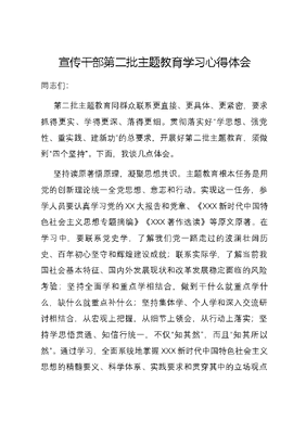 宣传干部第二批主题教育学习心得体会同志们:第二批主题教育同群众联系更直接、更具体、更紧密,要求抓得更实、学得更深、落得更细。贯彻落实好学思想、强党性、重实践、建新功的总要求,开展好第二批主题教育,须做到四个坚持。下面,我谈几点体会。坚持读原著悟原理,凝聚思想共识。主题教育根本任务是用党的创新理论统一全党思想、意志和行动。实现这一任务,参学人员要认真学习党的XX大报告和党章、《XXX新时代中国特色社会主义思想专题摘编》《XXX著作选读》等原文原著。在学习中,要联系党史学,了解我们党一路走过的波澜壮阔历史、百年初心坚守和辉煌建设成就;联系实际学,了解当前我国社会基本特征、国内外发展现状和改革发展稳定面临的风险考验;坚持全面学和重点学相结合,做到干什么就重点学什么,缺什么就重点补什么;坚持集体学、个人学和深入交流研讨相结合,从宏观上把握,从细节上领会,从行动上落实;坚持学思悟贯通、知信行统一,不仅知其然,而且知其所以然。通过学习,全面系统地掌握XXX新时代中国特色社会主义思想的精髓要义、科学体系、实践要求和贯穿其中的立场观点方法,把学习成果转化为坚定理想、锤炼党性和指导实践、推动工作的强大精神力量。坚持深对照细查摆,提升党性修养。学习不能只停留在认知层面,要对照XXX新时代中国特色社会主义思想和党章,检查自己是否达标合格,推进学习从认知层面转入思想层面,从思想层面内化为行动自觉。对照查摆要敢于触及灵魂深处,联系个人思想和工作实际,认真查摆是否做到为党分忧、为民尽责、为美好时代拼搏,个人知识、能力是否胜任本职岗位;工作中有没有形式主义、官僚主义、享乐主义和奢靡之风,有没有照抄照搬、简单应付,对待难题有没有回避推诿、裹足不前,遇到错误言论或不良风气是否敢于斗争、善于斗争,遇到个人挫折有没有消极躺平、牢骚抱怨;生活中是否做到奉公守法、廉洁自律,有没有违反纪律规定和党性要求等。通过对照查摆,发现差距不足,明确努力方向,真正在内心深处树牢勤政为民的服务意识、迎难而上的担当意识、勇闯新路的创新意识,掸除身上政治灰尘,坚定理想信念,夯实党性根基,切实提升政治三力,增强四个意识,坚定四个自信,做到两个维护,激发起干事创业的蓬勃朝气和昂扬锐气。坚持进街巷入村组,深入调查研究。要在主题教育中自觉把自己沉入基层,融入群众,扎实开展调研,走好新时代群众路线。调研要采取四不两直方式,轻车简从,减少中间环节和陪同人员,在微服私访中听真话、见真情、辨真相,切不可前呼后拥、走马观花、蜻蜓点水;要坚持问题导向,围绕日常工作难点、社会发展堵点和群众反映热点,俯下身,侧耳听,用心问,细心记,真正找准问题及其产生原因、研究提出解决问题的对策措施;要坚持民生为上,锦上添花场所少去,雪中送炭地方多跑,杜绝刮风式调研,运动式蹲点;要建立问题台账,认真起草调研报告,做到有调查有研究,有信息有分析,有建议有对策;要抓好调研成果转化,向上汇报情况,向下反馈问题,向群众通报进展。坚持解难题建机制,增进民生福祉。主题教育最终要落实在以学促干上,体现在解决民生难题、增加民生福祉上。这是党的性质、宗旨所决定,也是完成新时代党的使命、任务所需要。要切实抓好与群众生活息息相关的民生工作,有效提升社会保障能力和民生服务水平,有效从体制机制层面解决群众上学难、看病贵、就业难、房价高等问题。要大力弘扬枫桥经验,有效化解基层矛盾,让社会更和谐、邻里更友善。做到对群众深恶痛绝的事零容忍、对群众急难愁盼的事零懈怠。要坚持当下改与长久立相结合,对主题教育中形成的好经验好做法大力推广、建章立制,对主题教育中发现的各类问题彻底整改、举一反三,建立和完善巩固主题教育成果的机制。发言完毕,谢谢大家!