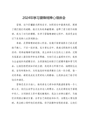 2024年学习雷锋精神心得体会雷锋,这个闪耀着光辉的名字,如同夜空中最亮的星,照亮了我们前行的道路。他以无私的奉献精神,诠释了爱与责任的真谛,成为了时代的楷模。在学习雷锋精神的过程中,我深受启发以下是我的六点深刻体会:奉献,是雷锋精神的核心所在。他毫不保留地将自己的关爱给予他人,不求一丝回报。在日常生活中,我通过积极参与志愿活动,将奉献精神付诸实践。我主动参与社区的义工活动,定期为孤寡老人提供陪伴和生活帮助,为他们送去温暖和关怀;我参与公益组织的捐赠活动,为贫困地区的孩子们捐赠书籍和学习用品,让他们感受到知识的力量;我还参与环保行动,清理街区垃圾,宣传环保知识,为创造美好环境贡献自己的一份力量。每一次的奉献,都是我成长为更好的人的磨砺,让我体会到了给予的快乐和满足。雷锋总是乐于助人,他的善良之举如春风般温暖着每一个人的心灵。我们应该学会关注身边人的需求,尤其是那些处于困境中的人。当同事在工作中遇到难题时,我会主动伸出援手,与他们共同探讨解决方案,分享自己的经验和知识;当朋友心情低落时,我会耐心倾听他们的烦恼,给予鼓励和安慰的话语,让他们重新振作起来。这些小小的善举,或许只是举手之劳,但却可能成为他人生活中的一道光,为他们带来希望和改变。雷锋对工作的热情和尽责态度,深深地激励着我们。他的敬业精神告诉我们,要热爱自己的工作,以高度的责任感和专业素养对待每一项任务。我时刻保持学习的状态,不断提升自己的专业技能,积极追求卓越。通过参加行业培训、阅读专业书籍和论文,以及与同行交流,我不断拓宽自己的知识领域,提高工作的质量和效率。在工作中,我也积极主动地发现问题并努力解决它们。当团队面临一个棘手的项目时,我主动承担更多的责任,带领团队成员共同分析问题、寻找解决方案,并最终成功完成任务我深知,无论工作岗位大小,都应该全力以赴,充分发挥自己的才能,实现个人价值的最大化。雷锋生活简朴,勤俭节约的品质在当今社会更显得珍贵。在物质丰富的今天,我们应当更加珍惜资源,不浪费任何一点一滴当外出就餐时,我会适量点餐,尽量做到光盘行动,避免食物的浪费;在日常生活中,养成随手关灯、关水的习惯,节约每一度电和每一滴水;购物时,我会理性消费,注重商品的质量和实用性,不盲目追求名牌和奢侈品。同时,我也学会了理财,合理规划生活开支,制定每月的预算计划,避免不必要的消费。还要减少不必要的娱乐消费,将节约下来的钱用于投资自己的学习和成长。这种勤俭节约的生活方式,不仅让我更加懂得珍惜资源也让我在物质欲望面前更加从容和坚定。雷锋关心集体,注重团结同志。我们要学会与他人合作,培养团队精神。在集体中,我尊重他人的意见,善于发现并发挥自己的优势,与团队成员共同为实现目标而努力。我积极参与团队活动,与同事们友好相处,在工作中互相支持和帮助。我主动分享自己的经验和技能,帮助新同事尽快适应工作;在社区工作中我带头组织集体活动,如志愿者服务、社区文化活动等,增强社区的凝聚力和归属感。学习雷锋精神不仅要做好事,更要不断提升自己。我们应该努力学习新知识,提高自身素质和能力。我充分利用业余时间阅读各类书籍,参加专业培训课程,拓宽自己的知识面和视野。同时,我也培养了一种兴趣爱好,如绘画、摄影等,并不断挑战自我,提升个人技能。积极参加相关的比赛和展览,与其他爱好者交流和学习。通过不断进步,我能够更好地服务社会,将雷锋精神发扬光大。我坚信,只有不断提升自己,才能在实践中更好地传承和践行雷锋精神。总之,学习雷锋精神是一个长期而持续的过程。让我们将雷锋精神融入日常生活的点滴之中,用实际行动去践行。从身边的小事做起,让爱与温暖在我们身边蔓延。让雷锋精神在我们这一代继续绽放光芒,照亮世界的每一个角落。本文密:档编辑码gwsx2024
