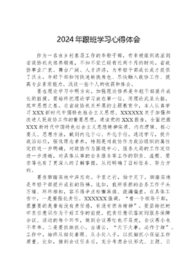 2024年跟班学习心得体会作为一名在乡村基层工作的年轻干部,有幸被组织选派到省政协机关培养锻炼,不知不觉已经有近两个月的时间。省政协事业广袤、舞台广阔、人才济济,为年轻干部成长成才提供了沃土。年轻干部如何快速转换角色、尽快融入政协工作、提高专业素质能力,浅谈一些个人的收获和体会。要在理论学习中明方向。加强理论修养是年轻干部提升成长的前提。要始终把理论学习放在第一位,用理论武装头脑,筑牢思想之基。在省政协机关开展的主题教育中,本人认真学习XXX新时代中国特色社会主义思想、XXXXXX关于加强和改进人民政协工作的重要思想,通读党的XXX报告,全面把握XXX新时代中国特色社会主义思想精神实质、内在逻辑、核心要义、思想方法,做到内化于心、外化于行。通过学习,提升政治站位,强化理念素养,特别是对政协作为政治组织的属性定位进一步明确,对政协作为围绕中心、服务大局的工作定位进一步清晰,对具体从事的会务服务等工作的职责、流程、要求等也有了更深入的了解掌握,从而明确了目标任务、努力方向。要在脚踏实地中淬志向。千里之行,始于足下,脚踏实地是年轻干部提升成长的阶梯。比如,我所承担的会务工作千头万绪、环环相扣,容不得半点松懈麻痹、疏漏偏差。在具体工作中,一是要强化责任。XXXXXX强调,看一个领导干部,很重要的是看有没有责任感,有没有担当精神。要坚持把树牢责任意识作为干好工作的前提,把责任意识落实到服务保障会议、活动的每个环节,做到会议再忙也不马虎,会议再小也不草率。二是要抓细抓小。古语云,天下大事,必作于细。工作中,始终从细处着眼、从小处入手,以抓细抓小保证工作质量。比如,接到会议任务后,充分考虑会议形式、主题、日程、材料、座次安排等具体环节;对于会议通知、材料摆放等细节反复检查、认真核对,做好每一个环节,抓好每一件小事,确保精益求精、万无一失。三是要锤炼作风。良好的作风是干好工作的基本保障。在工作中经常会碰到临时性会议,这就需要时刻保持备战状态,对组织安排的任务必须迅速行动、积极落实,坚决做到马上就办、办就办好。要在钻研业务中练筋骨。扎实的业务知识是干好工作的基本功。以省拜祖大典办公室为例,面对如此重大的活动,深感自己在思想上有束缚、视野上有局限、能力上有短板、知识上有弱项、经验上有不足。为了更快融入拜祖大典筹办工作,我做了以下准备功课:一是研读黄帝文化。我在网上阅读黄帝传说的相关知识,研读了一些专家的专题研究成果,充分认识到黄帝文化是中华文化的源头,在中华民族多元一体格局形成与发展的过程中,需要我们一代一代做好保护传承,不断将其发扬光大、凝心铸魂。二是学习拜祖大典知识。通过学习我了解到,拜祖大典至今已经举办18届。举办拜祖大典,不仅能够提升我省知名度、树立我省新形象,而且能够吸引海内外炎黄子孙前来寻根拜祖,激发全球华人对中华文明的认同和自信,助推铸牢中华民族共同体意识,为推动祖国和平统一、世界和平发展发挥积极作用。三是熟悉会议活动工作流程。我深入学习会议活动的业务知识,特别是认真学习《拜祖大典筹办工作指南》,仔细研读近几年拜祖大典的资料汇编,虚心请教筹办经验丰富的领导和同事,通过多方面的学习,对相关知识、工作流程、工作要求等都有了较全面的了解。要在廉洁从政中锻党性。廉洁自律是年轻干部不出事、干成事的基础,更是对年轻干部的严肃政治考验。年轻干部在工作中要始终做到严守规矩、不逾底线。一要心存敬畏。敬畏党纪国法,自觉学习党章党规党纪,弄清楚该做什么、不该做什么,守住纪律、法律、道德的底线,守住做人、处事、交友的底线,不出格、不逾矩。二要严以律己。始终拧紧世界观、人生观、价值观的总开关,提高思想觉悟、精神境界,常掸心灵灰尘,常清思想垃圾,从小事小节上加强约束、规范自己。三要正心明道。时刻牢记入党誓言,自觉以党的事业为念,以国家和民族前途为念,把本职岗位作为实现人生价值的平台,恪尽职守,埋头苦干,树立和维护好形象。