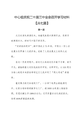 中心组庆祝二十届三中全会召开学习材料【共七篇】第一篇从历史深处奔涌而来,向着民族复兴澎湃而去,改革开放潮涌东方,新时代中国日新月异。史诗般的进步,新中国成立75年来,中国从一穷二白发展为世界第二大经济体,创造了人类发展史上的伟大成就。在这一历史进程中,新时代以来的这些年极不寻常、极不平凡,面临的重大风险挑战世所罕见、史所罕见,以XXX同志为核心的党中央团结带领亿万人民书写了两大奇迹新篇章。重庆赛力斯汽车超级工厂,一分钟下线两台新能源汽车。这家全球标杆级数字化工厂,超3000台机器人智能协同,实现关键工序100%自动化;运用质量自动化测试技术,实现100%质量监测追溯。中国新能源汽车蓬勃发展,引领全球汽车产业绿色转型,见证我国从汽车大国迈向汽车强国的坚实步伐。2023年,我国跃升为全球最大的汽车出口国,新能源汽车产销量占全球比重超过60%,连续9年位居世界第一。时间是常量,也是奋进者的变量。党的十八大后,XXXXXX第一次出京考察来到广东深圳,就是要向世界宣示中国改革不停顿、开放不止步。放眼今日之中国,日均诞生企业超过2.7万家、授权发明专利2500多件,京津冀协同发展、粤港澳大湾区建设、长三角一体化发展等区域重大战略高质量推进,22个自贸试验区覆盖东西南北中、海南自贸港建设蓬勃兴起..历史是勇敢者创造的。从落后时代到赶上时代再到引领时代,改革开放深刻改变了