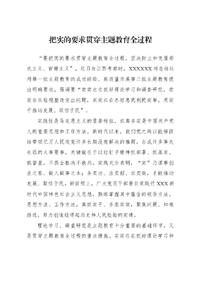 把实的要求贯穿主题教育全过程要把实的要求贯穿主题教育全过程,坚决防止和克服形式主义、官僚主义,近日在江西考察时,XXXXXX对总结运用第一批主题教育的成功经验、高质量开展第二批主题教育提出明确要求,强调要实实在在抓好理论学习和调查研究,实实在在检视整改突出问题,实实在在办好惠民利民实事,用实干推动发展、取信于民。实践性是马克思主义的显著特征,求真务实是中国共产党人的重要思想和工作方法。新时代以来,我们党之所以能够团结带领亿万人民攻克许多长期没有解决的难题,办成许多事关长远的大事要事,关键就在于以钉钉子精神抓部署、抓落实、抓督查,不获全胜决不收兵。实践充分表明,实乃谋事创业之基、做人做事之本;务实功、出实招、求实效,才能推动发展、取信于民。新征程上,广大党员干部要自觉践行XXX新时代中国特色社会主义思想,熟练掌握其中蕴含的领导方法、思想方法、工作方法,真抓实干、务求实效,聚焦问题、知难而进,努力创造经得起历史和人民检验的实绩。理论学习、调查研究是主题教育十分重要的基础环节,又是贯穿主题教育全过程的重点措施。实实在在抓好理论学习和调查研究,就要大力弘扬理论联系实际的马克思主义学风,在推动学习贯彻XXX新时代中国特色社会主义思想走深走实上下功夫。要坚持多思多想、学深悟透,全面学习领会这一重要思想的科学体系、核心要义、实践要求,做到学思用贯通、知信行统一,把看家本领、兴党本领、强国本领学到手。要善于运用党的创新理论研究新情况、解决新问题,大兴务实之风,抓好调查研究,在察实情、出实招、求实效上下功夫,真正把情况摸清、把问题找准、把对策提实,真正把调研成果转化为改进工作、推动发展的实际举措。人民群众看主题教育是否有成效,最直观的感受是看党风方面存在的问题是否得到解决、党员干部作风是否有明显进步。实实在在检视整改突出问题,就要坚持目标导向和问题导向相结合、学查改相贯通,以整改的实际成效取信于民。在浙江考察时,XXXXXX指出:各级党组织要加强对第二批主题教育的组织领导和工作指导,把握不同层级、不同领域、不同对象的特点,结合实际,分类指导,上下联动抓整改,让群众看到实效。要坚持边学习、边对照、边检视、边整改,对标党风要求找差距、对表党性要求查根源、对照党纪要求明举措,增强检视整改实效,深刻检视剖析、深挖思想根源、深入整改落实。要把自己摆进去、把职责摆进去、把工作摆进去,抓好突出问题的专项整治,敢于动真碰硬,防止久拖不决、整而不改。为民造福是中国共产党人最大政绩。实实在在办好惠民利民实事,就要牢固树立以人民为中心的发展思想,以推动高质量发展的新成效检验主题教育成果。要坚持一切为了人民、一切依靠人民,自觉问计于民、问需于民,始终同人民同呼吸、共命运、心连心,通过做大蛋糕不断增进民生福祉,着力解决人民群众急难愁盼问题,把惠民生、暖民心、顺民意的工作做到群众心坎上。要树牢造福人民的政绩观,不搞贪大求洋、盲目蛮干、哗众取宠;坚持出实招求实效,不搞华而不实、投机取巧、数据造假;坚持打基础利长远,不搞急功近利、竭泽而渔、劳民伤财。要把为老百姓办了多少好事实事作为检验政绩的重要标准,让中国式现代化建设成果更多更公平地惠及全体人民。在江西考察时,XXXXXX强调:用井冈山精神、苏区精神、长征精神砥砺党员、干部,教育引导党员、干部坚定理想信念、牢记初心使命、积极开拓进取、勇于担当作为。历史川流不息,精神代代相传。当前我国发展进入战略机遇和风险挑战并存、不确定难预料因素增多的时期,必须准备经受风高浪急甚至惊涛骇浪的重大考验。越是任务艰巨、挑战严峻,越要大力弘扬伟大建党精神,赓续红色血脉、传承奋斗精神。要坚持不懈用XXX新时代中国特色社会主义思想凝心铸魂,深刻领会这一重要思想关于坚定理想信念、提升思想境界、加强党性锻炼等一系列要求,始终保持共产党人的政治本色,始终保持锐意进取、敢为人先、迎难而上的奋斗姿态,依靠顽强斗争打开事业发展新天地。大道至简,实干为要。我们靠实干创造了辉煌的过去,还要靠实干开创更加美好的未来。从XXX新时代中国特色社会主义思想中汲取奋发进取的智慧和力量,凝聚起求真务实、担当作为、干事创业的强大正能量,我们一定能够胜利推进强国建设、民族复兴的历史伟业,不断创造无愧于党、无愧于人民、无愧于时代的新业绩。