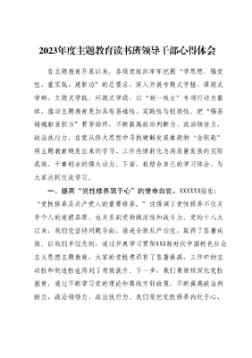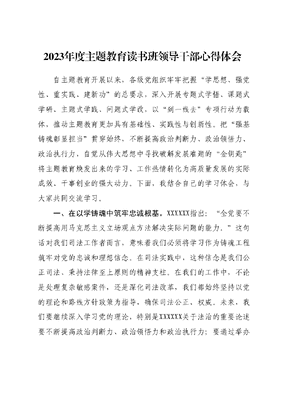 2023年度主题教育读书班领导干部心得体会自主题教育开展以来,各级党组织牢牢把握学思想、强党性、重实践、建新功的总要求,深入开展专题式学悟、课题式学研、主题式学践、问题式学改,以到一线去专项行动为载体,推动主题教育更加具有基础性、实践性与创新性。把强基铸魂彰显担当贯穿始终,不断提高政治判断力、政治领悟力、政治执行力,自觉从伟大思想中寻找破解发展难题的金钥匙将主题教育焕发出来的学习、工作热情转化为高质量发展的实际成效、干事创业的强大动力。下面,我结合自己的学习体会,与大家共同交流学习。一、强化理论武装,坚定理想信念。XXXXXX指出:理论上的清醒和坚定是行动上的清醒和坚定的前提。这句话深刻表明了理论武装对于共产党人意志和行动的指导重要性。历史的经验告诉我们,理论的力量是无穷的。例如,在改革开放的伟大实践中,正是因为我们党坚持以邓小平理论指导实践,才能开辟了中国特色社会主义道路。在这一理论指导下,我们地方的发展有了长足的进步。通过深入学习和实践,我们的产业结构不断优化,科技创新能力显著提升,人民生活水平大幅改善。下一步,我们要继续深化理论学习,确保理论学习有收获,思想上有所觉醒,行动上有所指引。要用XXX新时代中国特色社会主义思想武装头脑指导实践,推动工作。二、增强宗旨意识,夯实工作作风。XXXXXX强调:全心全意为人民服务是我们党的根本宗旨。我们党的一切工作,都必须以最广大人民根本利益为最高标准。在我们的实践中,这一宗旨意识体现在每一个具体工作中,无论是在经济建设,还是在文化教育,抑或是在生态环境保护。我们所在单位曾面临工作效率低下的问题,但通过增强宗旨意识,转变工作作风,我们提高了服务质量和效率,获得了群众的广泛认可下一步,我们要继续深化宗旨意识教育,做到知行合一。要用实际行动诠释全心全意为人民服务的根本宗旨,如加强基层联系,改进工作方法,提升服务效能。三、严守纪律规范,坚持廉洁自律。XXXXXX指出:要以钉钉子精神抓好作风建设,确保党中央政令畅通。纪律的严明是党的生命。我们党历来重视纪律建设,无论是在革命时期还是在和平建设时期,都强调纪律的重要性。在我们的工作中,我们通过严格执行党的纪律规定,建立了一套完善的监督机制,有效预防了违纪行为的发生。下一步,我们要加强纪律建设,持之以恒正风肃纪。要把纪律挺在前面,用制度约束权力,用监督保障执行,确保党组织纯洁性。同志们,理论武装的提高、宗旨意识的增强、纪律规范的严守,是我们每一位党员领导干部必须长期坚持的工作。让我们以此次党课为新的起点,不断提升自身素质,为实现中华民族伟大复兴的中国梦贡献力量。