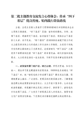 第二批主题教育交流发言心得体会:传承四下基层优良传统,始终践行群众路线当前,全党正在深入开展学习贯彻XXX新时代中国特色社会主义思想主题教育。四下基层是指:宣传党的路线、方针、政策下基层;调查研究下基层;信访接待下基层;现场办公下基层国之大者,在乎民也。四下基层是XXXXXX在福建宁德工作时大力倡导并身体力行形成的工作方法和工作制度,为党员干部践行党的群众路线树立了光辉典范。走好新时代四下基层之路党员干部要深刻把握四下基层的丰富内涵、时代价值和实践要求,大力传承弘扬这一优良传统,不断开创各项事业发展新局面。一、政策宣传要门到户说、晓之以理。学思用贯通、知信行统一,理论学习是主题教育的首要任务。XXXXXX在系统阐述四下基层时,把宣传党的方针政策下基层摆在突出位置,强调既要面上推动、广泛持续,更要具体问题具体分析,了解掌握基层群众的政策需求和接受特点,大力开展丰富多彩、生动活泼的宣传教育,有效解开群众思想上的扣子。新形势下,宣传党的方针政策下基层,广大党员干部要真正深入田间地头、集贸市场文化广场等宣传阵地,下足绣花功夫精准把握群众的政策诉求,聚焦三农、法律、信息服务等民生实事,以一些群众喜闻乐见的生动形式进行通俗化解读、互动式交流,少一些大水漫灌、照本宣科,多一些冒热气的乡土话,真正练就走得进、坐得下、聊得开的基本功,发出理论宣讲好声音,不断号召群众、组织群众、发动群众,让党的理论政策飞入寻常百姓家。二、调查研究要寻根究底、身入心至。在全党大兴调查研究以深化调查研究推动解决发展难题,是这次主题教育的重要内容和鲜明特色。调查研究下基层是四下基层工作制度的重要方面,有推动工作思路、举措、办法创新的重要作用。在福建工作期间,XXX同志始终坚持先调研后决策,以身作则深入基层发动群众、依靠群众、组织群众,把工作抓实、基础打实、步子迈实。广大党员干部只有真正运用好这一重要做法解决困惑、优化方法才能做到方向明确、头脑清醒、应对有方、行动有力。在调研过程中,要始终以调查研究为锐利之刃,主动扑下身子、沉到一线保持求真务实的作风,坚持问政于民、问需于民、问计于民,自觉向基层干部取经、向农民群众求学,实打实掌握问题真真正正解决问题,做到民有所呼、政有所应。三、信访接待要问诊解难、立行立改。信访工作是党和政府与群众之间的连心桥,是沟通民情、知晓民意的窗口。XXXXXX高度重视信访工作,早年在福建宁德工作时就推动建立领导干部下访制度。在浙江工作期间,他坚持这一做法,推动形成了变群众上访为领导下访,深入基层,联系群众,真下真访民情,实心实意办事为主要内容的浦江经验。经过20年的发展,浦江经验展现出强大的生命力,在新时代熠熠生辉。广大党员干部要学好用好浦江经验,树牢人民至上理念,紧盯群众急难愁盼问题,多措并举畅通群众意见建议和矛盾纠纷的反映渠道,常态化开展领导干部定期接访、定期下访、包案化解活动,坚持把信访工作做到群众的心坎上,努力把问题解决在基层、解决在萌芽状态,切实做到问题在一线解决、工作在一线推动,从源头上、根本上攻坚克难,让群众增福祉、得实惠,过上好日子。四、现场办公要下至门口、主动服务。在一线办实事、到现场抓落实,是打通服务群众最后一公里的有效举措,也是推动主题教育见行见效的重要途径。现场办公下基层不仅拉近了机关与基层、领导与群众的距离,更是解民忧、惠民生的重要体现在福建工作期间,XXXXXX既倡导现场办公下基层,又力推马上就办,要求把工作着力点主动放在基层一线。将推动解决群众急难愁盼问题从向上反映到现场解决,不仅能彰显党员干部率先垂范的担当作为,还能够提升广大群众的获得感、幸福感、安全感。因此,广大党员干部要坚持真抓实干,利用好一线工作法,带着责任、带着任务、带着措施深入基层办实事、解难题,以真抓的实劲、敢抓的狠劲、常抓的韧劲,提供群众办事一站式服务,实现民生实事项目式推进,不断开创事业发展新局面。群众路线是我们党的生命线和根本工作路线,是我们党永葆青春活力和战斗力的传家宝。当前,我市正处于昂首阔步奋进现代化建设新征程的关键时刻,我们要深刻把握四下基层的丰富内涵、时代价值和实践要求,走好新时代四下基层之路,高质量推进第二批主题教育,不断开创各项事业发展新局面。