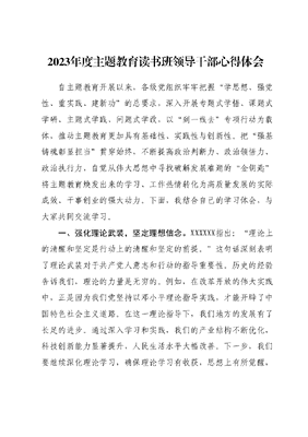 2023年度主题教育读书班领导干部心得体会自主题教育开展以来,各级党组织牢牢把握学思想、强党性、重实践、建新功的总要求,深入开展专题式学悟、课题式学研、主题式学践、问题式学改,以到一线去专项行动为载体,推动主题教育更加具有基础性、实践性与创新性。把强基铸魂彰显担当贯穿始终,不断提高政治判断力、政治领悟力、政治执行力,自觉从伟大思想中寻找破解发展难题的金钥匙将主题教育焕发出来的学习、工作热情转化为高质量发展的实际成效、干事创业的强大动力。下面,我结合自己的学习体会,与大家共同交流学习。一、提高党性修养筑于心的使命自觉。XXXXXX指出:党性修养是共产党人的重要修养。这强调了党性修养不仅关乎个人的道德品质,也关系到党的纯洁性和战斗力。党的十八大以来,我们党坚持问题导向,推进全面从严治党,取得了显著成效。以我们单位为例,通过开展学习贯彻XXX新时代中国特色社会主义思想主题教育,大家的党性意识有了显著提高,工作中的主动性和创造性也得到了有效提升。下一步,我们要继续深化党性教育,通过不断学习党的理论和路线方针政策,不断提高政治判断力、政治领悟力、政治执行力。我们要把党性修养内化于心、外化于行。二、筑牢革命理想高于天的坚定信念。XXXXXX强调:革命理想高于天,是我们共产党人的政治灵魂。这说明了坚定的理想信念是我们每一名党员不断前进的动力源泉。革命先辈们用鲜血和生命铸就了我们党的理想信念。在过去的工作中,我们始终将革命理想作为前进的方向标,这使我们在推动社会主义现代化建设的道路上取得了一项项成就。下一步,我们要不断加强理想信念教育,确保每一名党员都能在思想上与党中央保持高度一致,在行动上紧跟党的步伐,筑牢信念之基,坚定信念之心三、涵养一枝一叶总关情的为民情怀。XXXXXX指出:人民对美好生活的向往就是我们的奋斗目标。这句话深刻体现了我们党一切工作的出发点和落脚点都是为了人民的根本利益无数事实证明,当党员干部心系群众,一切工作自然水到渠成。在我们的实践中,始终坚持以人民为中心的发展思想,努力解决群众的疾苦,得到了群众的广泛认可和赞誉。下一步,我们要进一步增强服务群众的意识,将为民情怀转化为具体行动,确保每项政策都能够贴近群众、惠及群众,真正做到心中有民,行中有为。四、永葆绝知此事要躬行的实干精神。XXXXXX提出:空谈误国,实干兴邦。这句话强调了实干是推动国家发展的根本。回顾我们党的发展历程,无数次的伟大成就都是在实干中取得的。在我们单位的具体工作中,我们始终坚持问题导向,以钉钉子精神抓落实,通过实际行动解决了一系列难题,推动了单位的发展。下一步,我们要继续弘扬实干精神,坚持以目标为导向,以结果为标准,确保每项工作都能落到实处,以实际成效体现学习的价值。