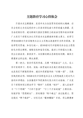 主题教育学习心得体会开展本次主题教育,是党中央为全面贯彻党的XX大精神、动员全党同志为完成党的中心任务而团结奋斗所作的重大部署,是为奋进新征程、建功新时代提供坚强有力的政治引领和政治保障广大党员干部要充分认识开展本次主题教育的重大意义,把学习贯彻XXX新时代中国特色社会主义思想主题教育作为终身课题。坚持学思用贯通、知信行统一,把XXX新时代中国特色社会主义思想转化为坚定理想、锤炼党性和指导实践、推动工作的强大力量,突出求真务实、真抓实干,切实解决群众急难愁盼问题,确保主题教育出彩出效、群众满意。第一把火:坚持学思用贯通,点燃理想信念之火。在工作中实现学习、思考、实践一体贯通向来是我们党的优良传统,也是我们不断取得革命、建设和改革胜利的关键一招。无数实践实例证明,XXX新时代中国特色社会主义思想就是立足时代之基的科学理论,全面推进中华民族伟大复兴的行动指南。广大党员干部要切实以理论学习燃料为思想熔炉,深入系统学习十个明确十四个坚持十三个方面成就主要内容,彻底铲除思想病灶,深刻领悟两个确立决定性意义,坚定做到两个维护,切实达到提神醒脑目的。将主题教育作为增强政治意识、强化党性锻炼的长期过程,把对党忠诚体现在坚决贯彻党中央决策部署的行动上,体现在履职尽责的实效上体现在日常言行上。真正达到凝心铸魂筑牢根本、锤炼品格强化忠诚、实干担当促进发展、践行宗旨为民造福、廉洁奉公树立新风的目标。第二把火:坚持知信行统一,点燃担当奋斗之火。中国共产党是什么、要干什么,这是广大党员干部在任何时候都必须牢记的根本问题,做到知其然、信其所以然、行其所以必然在实干中担当,在奋斗中作为,坚定走好新时代赶考之路。主题教育不仅在于知,更在于行,必须内化于心、外化于行,做到直面矛盾、破解难题,本领过硬、担当作为,联系实际、融入实践。牢固树立把工作当成事业干的思想,杜绝搞包装造盆景式开展,把推动主题学习教育成效同做好中心工作结合起来,争当行动派实干家,在推动经济社会高质量发展中,不断拓展干事创业的动力、举措和成效,开创党和国家事业发展新局面。把理论学习、调查研究、推动发展、检视整改贯通起来,有机融合、一体推进,着力解决理论学习、政治素质、能力本领、担当作为、工作作风、廉洁自律等6个方面的问题。第三把火:坚持惠民生解民忧,点燃群众满意之火。以人为本,执政为民始终是我们党的执政理念和施政要领,推进中国式现代化,必须永远保持同人民群众的血肉联系,践行以人民为中心的发展思想。党内前期开展的不忘初心、牢记使命主题教育、党史学习教育与本次学习贯彻XXX新时代中国特色社会主义思想主题教育本质上是一脉相承的,就是要让广大党员干部牢记全心全意为人民服务的根本宗旨,坚定信仰信念、庚续红色血脉,解决群众急难愁盼问题、在实干中促进发展。在主题教育过程中,要坚持把群众呼声作为改进工作的第一信号,把维护群众利益作为开展工作的第一职责,把群众满意与否作为衡量工作的第一标准,汇好民生清单、算好发展账单、践行政府买单。大兴调查研究之风,常态化开展走出办公室到一线调研活动,拜群众为师,把群众路线作为解决问题、化解矛盾的基本方法,坚决反对和防止形式主义,务求取得实效。