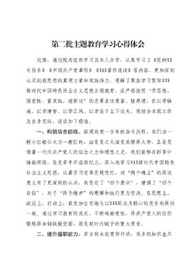第二批主题教育学习心得体会近期,通过院内组织学习及本人自学,认真学习了《党的XX大报告》《中国共产党章程》《XXX著作选读》等内容,更加深刻认识到新思想的真理力量和实践伟力,理解了聚焦学习贯彻XXX新时代中国特色社会主义思想主题教育,应严格按照学思想、强党性、重实践、建新功的总要求读原著、悟原理,在以学铸魂、以学增智、以学正风、以学促干上下功夫,现结合本职工作及自身实际,谈谈如下感悟。一、构筑信念防线。纵观我党一百年的奋斗历程,我们由一艘小红船壮大为一艘巨轮,由星星之火演变成燎原大势,正是凭借着一代代共产党人的信念之力和理想之光,我们能够在困苦中铸就辉煌,在变革中开启新纪元。深入地学习XXX新时代中国特色社会主义思想,认真学习党章党规党纪,对两个确立的深远意义有了更深刻的认识,我坚定了四个意识,增强了四个自信,对于两个维护的理解和执行更为坚决。在思想上、政治上、行动上,我更加自觉地与以XXX同志为核心的党中央保持一致。通过学习教育的洗礼,不断砥砺党性,将共产党人的信仰锻炼得如钢铁般坚固,肩负起时代赋予的重大责任。二、提升履职能力。若言辞未能贯彻行动,再多的知识也只是虚有其表。离开了实践,再宏伟的蓝图不过是泡影,再伟大的理想也仅是一场梦。实践是检验真理的唯一途径,注重实践、勤于实践是每位党员干部应具备的素质。在主题教育中,我坚持深入基层进行调研,亲临第一线、深入民生,对服务人民的核心价值有了更深入的了解,对以人民为中心,坚守不懈奋斗的方向更为清晰,对领导干部率先垂范的政治责任更积极地担当,并在实践中不断丰富自身的知识体系,增强解决问题和创新工作的能力。三、强化使命担当。当前,我们正处于推进中国特色现代化新征程,朝着第二个百年奋斗目标前进的关键时刻。XXXXXX寄语我们当代中国青年正处于大有可为的时代,施展才华的舞台广阔无垠,实现梦想的未来光明无限。在主题教育中,我围绕新时代党的核心任务,立足本职岗位,详尽梳理工作目标、实施方案及预期成效,积极发扬党的建设精神,积极主动工作,勇于担当,在面对工作中的困难和问题时敢于直面挑战,勇于解决问题。同时,学习教育也增强了对廉洁自律、清廉从政的理解,对守护底线、构建防线的重要性有了更清晰的认识,在自律、自省、自警自励方面更加坚定,为廉洁从政搭建了坚实的防线。