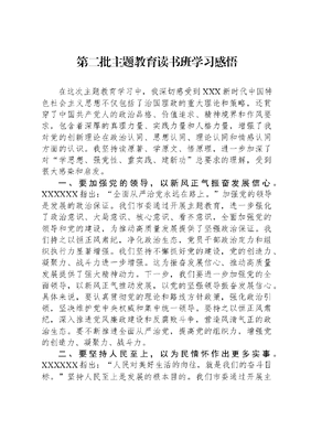 第二批主题教育读书班学习感悟在这次主题教育学习中,我深切感受到XXX新时代中国特色社会主义思想不仅包括了治国理政的重大理论和策略,还贯穿了中国共产党人的政治品格、价值追求、精神境界和作风要求,包含着深厚的真理力量、实践力量和人格力量,增强了我对党的创新理论在政治认同、思想认同、理论认同和情感认同方面的认识。我坚持读原著、学原文、悟原理,进一步加深了对学思想、强党性、重实践、建新功总要求的理解,受到很大感染和启发。一、要加强党的领导,以新风正气振奋发展信心。XXXXXX指出:全面从严治党永远在路上。加强党的领导是发展的政治保证。我们市委通过开展主题教育,进一步强化了政治意识、大局意识、核心意识、看齐意识,全面加强党的领导和党的建设,为推动高质量发展提供了坚强政治保证。我们持之以恒正风肃纪,净化政治生态,党员干部政治定力和组织执行力显著增强。我们坚持不懈抓好党的建设,党的创造力、凝聚力、战斗力进一步增强。这为振奋发展信心、推动高质量发展提供了强大精神动力。下一步,我们要进一步加强党的全面领导,以新风正气推动发展,以党的坚强领导振奋发展信心。具体来说,要认真贯彻党的理论和路线方针政策,强化政治引领,坚决维护党中央权威和集中统一领导。要持之以恒正风肃纪,深入推进党风廉政建设和反腐败斗争,营造风清气正的政治生态。要不断推进全面从严治党,提高党的组织力,增强党的创造力、凝聚力、战斗力。二、要坚持人民至上,以为民情怀作出更多实事。XXXXXX指出:人民对美好生活的向往,就是我们的奋斗目标。坚持人民至上是发展的根本目的。我们市委通过开展主题教育,进一步强化了全心全意为人民服务的宗旨意识。我们深入基层一线,倾听群众心声,把解决好人民最关心最直接最现实的利益问题作为工作重点。我们抓住群众最关心的民生问题先行先试,让人民群众有更多获得感。这充分体现了我们坚持人民至上的一以贯之的立场。下一步,我们要进一步坚持人民至上,以为民情怀统揽工作大局,以更优质高效的公共服务和民生实事回应人民期盼。具体来说,要深入基层一线调查研究,充分了解人民群众需求,把解决好人民最关心最直接最现实的利益问题作为工作重点。要抓好教育、医疗、就业、社保、住房等民生项目建设,切实提高人民群众获得感、幸福感、安全感。要不断完善基层民主,畅通民意表达渠道,推动基层治理制度化法治化智能化。三、要把握重大机遇,以高质量发展再创新佳绩。XXXXXX指出:发展是硬道理。推动高质量发展是我们的首要任务。我们市委通过开展主题教育,进一步强化了发展的使命担当。我们坚持深化供给侧结构性改革,经济发展活力进一步增强。这为推动高质量发展提供了强大动力。下一步,我们要进一步把握重大机遇,统筹发展和安全,以高质量发展再创佳绩。具体来说,要坚持以供给侧结构性改革为主线,推动经济结构优化升级。要积极融入新发展格局,牢牢抓住新一轮科技革命和产业变革机遇。要统筹经济社会发展,保持经济运行在合理区间。要坚持新发展理念,以创新驱动发展,推动高质量发展。