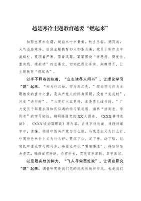 越是寒冷主题教育越要燃起来细雨生寒未有霜,庭前木叶半青黄。秋去冬临,朔风起,天气逐渐寒冷。恰逢主题教育如火如荼开展,党员干部作为中流砥柱,要顶着严寒、冒着风霜,紧紧围绕学思想、强党性、重实践、建新功的总要求,切实把理论夯实、荆棘劈开,让主题教育燃起来。以手不释卷的执着,立志读尽人间书,让理论学习燃起来。知为行之始,学为用之先。理论学习作为主题教育的重中之重,是共产党人的终身课题,没有完成时,只有进行时。三更灯火五更鸡,正是男儿读书时。广大党员干部要永葆如饥似渴的学习紧迫感、涵养活到老、学到老的学习韧性,精研悟透党的XX大报告、《XXX著作选读》、《XXX谈治国理政》等内容,在逐字逐句读、逐段逐篇学中,读懂、领悟中国共产党为什么能、马克思主义为什么行、中国特色社会主义为什么好。要沉下心、定下神、动下脑,切实扎牢理论学习的马步,将理论知识嚼细嚼透,将信仰信念夯实,确保日有所进、月有所长,实现常学常新、真学真信。以足履实地的脚力,飞入寻常百姓家,让调查研究燃起来。调查研究是我们党的优良传统和作风,也是我们走稳走实群众路线的重要工作途径。1927年1月到2月,毛泽东同志回到家乡湖南考察农民运动,每到一地,召集有经验的农民和农运工作同志开调查会,仔细听他们的报告,所得材料不少,写出了经典调研报告《湖南农民运动考察报告》,为后来轰轰烈烈的农民运动提供了宝贵的理论指导和战略部署。正所谓,知屋漏者在宇下,知政失者在草野,不入村庄,就不解农民之苦,不到社区,就不晓群众之忧。作为一名新时代的党员干部,要练好走基层、赴一线的脚力,要到田间地垄与群众话丰收,到农家户院与百姓唠家常、到偏远村小与孩子谈未来,确保民声融入报告中、跃然于纸上。以苦干实干的底色,绝知此事要躬行,让前进步子燃起来。XXXXXX强调,要坚持学思用贯通、知信行统一,匡正干的导向,增强干的动力,形成干的合力,在以学促干上取得实实在在的成效。主题教育的起点在学,落点在干,只有将学习成果运用到实际工作中,才能使主题教育发挥最大效果。广大党员干部要树立真抓实干的政绩观,发扬干事担事的工作作风,将理论学习转换为推动干事创业、攻坚克难的内生动力。大道至简,实干为要;责重如山,行胜于言。我们要把实干担当扛在肩上,坚持把加强民生保障、增进民生福祉作为根本出发点和落脚点,紧紧围绕就业、教育、医疗、托幼、养老等群众急难愁盼问题,以钉钉子精神抓落实,保持定力、保持韧劲、久久为功、善作善成。