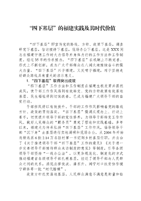 四下基层的福建实践及其时代价值 四下基层即宣传党的路线、方针、政策下基层,调查研究下基层,信访接待下基层,现场办公下基层。这是XXX同志在福建宁德工作时大力倡导并身体力行的工作方法和工作制度。经过35年的传承接力,四下基层在机制上不断完善、形式上不断创新,成为广大干部群众在八闽大地接续奋斗的强大力量。四下基层兴于福建,又反哺于福建,对于坚持走好群众路线具有重大的启示意义。1.四下基层取得突出成效四下基层工作方法和工作制度在福建生根发芽并蔚然成风,使干部工作作风得到有效转变、党的方针政策有效落地基层、民生福祉得到切实改善,已成为福建广大领导干部的自觉行动。干部作风得以有效提升。干部的工作作风影响着党的路线方针、政策的贯彻落实。四下基层强调从观念上、行动上着手,切实提升领导干部的党性修养,为领导干部转变工作作风、做好人民群众的勤务员奠定了理论和实践基础。多年以来,福建大力传承弘扬四下基层工作作风,倡导领导干部沉下身去基层进行实地调研和现场办公,从2004年开始连续选派6批2.14万名驻村第一书记到乡村基层任职,并出台了《关于推进领导干部四下基层工作的意见》《关于进一步完善领导干部接待群众来访制度的意见》等制度,引导各级领导干部坚持一线办公法,以更加规范化、制度化的方式推动福建省各级领导干部扎根基层,拉近了领导干部与人民群众之间的关系,涌现出廖俊波、潘东升、闽宁对口扶贫协作援宁群体等一批时代楷模。政策方针扎实落地基层。人民群众满意不满意是衡量和检验党的路线、方针、政策成效的根本标准。四下基层工作方法和工作制度强调要重视宣传工作,以生动形象的方式将党的路线、方针、政策传达到基层。为此福建以四下基层为着眼点,组织领导干部深入学习宣传贯彻党的创新理论,以生动鲜活的面对面讲解和集中宣讲让党的创新理论飞入寻常百姓家,如组建了理论宣讲轻骑兵福小团,深入基层采用当地方言或其他接地气的方式进行理论宣讲、解说政策形势。除此之外,福建省委宣传部、省委讲师团联合省广播电视局、省广播影视集团正式推出学习强国时间音频节目,用充满人情味、泥土味的语言全年无休播报党的路线、方针、政策。大范围、生动性的宣讲使党的创新理论在福建八闽大地生根发芽,推动党的路线、方针、政策深入基层,推动人民群众把党的正确主张转变为自觉行动。民生福祉得到切实改善。四下基层工作方法和工作制度强调以增进人民福祉作为一切工作的出发点和落脚点,以人民群众急难愁盼问题作为工作的突破口,在改善民生方面狠下功夫。福建以四下基层为重要抓手,坚持人民至上、为民造福,已连续30多年深入开展为民办实事项目,解决了一批又一批民生领域的突出问题。2019年底实现了全省现行标准下农村建档立卡贫困人口全部脱贫,创新探索民呼我为接诉即办信访评理等机制,着力解决基础设施建设、教育医疗资源分配、社会保障体系建设、就业创业服务等事关民生福祉的重大问题,人民群众的获得感、幸福感、安全感得到全面提升。2.把握好四下基层的精髓要义四下基层作为党的群众路线的实践创新,科学回答了为什么要做好群众工作怎样把群众工作做好等重大问题。35年来,四下基层不仅在八闽大地落地生根、薪火相传,构筑起一座座干群连心桥,其所坚守的人民至上的根本立场、所凸显的实干兴邦的鲜明品格、所贯穿的实事求是的思想路线,为进一步密切联系群众、畅通民意诉求通道、更好服务基层群众,提供了有力支撑。坚守人民至上的根本立场。历史由人民群众创造,人民群众是历史实践的主体,人民性是马克思主义的本质属性。XXX同志在福建工作期间强调,要牢记政府前面的人民两个字。坚持人民至上是六个必须坚持中的重要要求,也是贯穿XXX新时代中国特色社会主义思想的一条红线。四下基层强调把人民放在心中最高位置,努力做到聚力于民、问计于民、心系于民、取信于民。这种以人民为中心的价值导向,是对坚持党的群众路线的继承和创新,是XXX新时代中国特色社会主义思想人民性的生动体现。领导干部只有积极传承弘扬四下基层的优良传统,坚持站稳人民立场、把握人民意愿、尊重人民创造、集中人民智慧,始终将群众的利益摆在首位,才能在历史大势和时代潮流中确保党和人民赋予的权力始终用于为人民谋幸福、为民族谋复兴,不断实现人民对美好生活的向往。凸显实干兴邦的鲜明品格。反对空谈、崇尚实干是党的优良传统,是党在领导人民进行革命、建设和改革实践中不断夺取一个又一个胜利的关键所在。XXX同志在福建工作期间强调,要与民相知心,切实改进领导作风,深入群众,密切党同人民群众的联系,大力倡导马上就办、真抓实干。党的十八大以来,以XXX同志为核心的党中央多次强调空谈误国、实干兴邦,号召全党谋事要实、创业要实、做人要实。