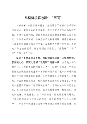 从榜样求解选调生三问《榜样8》专题节目的播出,生动展示了榜样们恪尽职守、不改初心、勇担使命的奋进面貌,在广大党员中引起热烈的反响。作为一名选调生,初到乡镇基层往往面临着身份认同不坚定、工作目的不清晰、办事方法不成熟等问题,亟需从榜样身上汲取坚定的理想信念作支撑、深厚的为民情怀作方向、务实的工作方法作抓手,解答选调生下基层之我是谁为了谁怎么做三问。坚定寄意寒星荃不察,我以我血荐轩辕的强大信念,以赤诚之心、冥冥之志解我是谁的第一问。生于炮火纷飞的年代,长在新中国的红旗下,八一勋章获得者、中国工程院院士钱七虎老先生用一甲子的时间实现了他年少时看到的那句不因虚度年华而悔恨,也不因碌碌无为而羞愧,用对党、对国家的坚定信念,构筑起新中国国防安全的基石,铸造起一座坚不可摧的地下钢铁长城。当得知被分到冷门专业时,钱七虎也没有任何怨言,而是选择相信党、相信组织,他夙兴夜寐、积极探索,在为国铸盾的道路上越走越远。伟大的目标来自于伟大的理想,伟大的理想产生巨大的动力,作为青年选调生应当学习钱老身上老党员至忠至贞、生死不渝的铿锵底色,尽心竭诚对党,全心全意为民,以远大理想和坚定信念扎根基层,奏响国家富强、民族复兴的新乐章。涵养先天下之忧而忧,后天下之乐而乐的为民情怀,以甘于奉献、勇于担当解为了谁的第二问。翻越罗坪山,跨过黑潓江,那个曾被称为江那边的山石屏村在苍山大医李桂科四十多年来的精心照料下,也终于痊愈。麻风病肆虐,众人避之不及,李医生冒着被传染的风险积极医治,九年奉献换来了山石屏村的身体健康;村民跨江难,交通出行不便,李医生带领全村人积极筹措和修建,五年辛勤疏通了山石屏村的大动脉;后代受歧视,村里没有学校,李医生不辞劳苦创造条件,就地建学,坚守不渝写就了山石屏村的精神药方。治病也治贫,医身更医心,李医生以拳拳初心改写了全村人的命运,托举起一个全新的幸福村。青年选调生当以李医生为榜样,倾尽全力、奉献所有、失志为民,始终牢记以人民为中心的发展思想,树牢群众观点,贯彻群众路线,以不变虔心和爱民恤民服务基层,绘就国泰民安、物阜民康的新画卷。弘扬纸上得来终觉浅,绝知此事要躬行的务实作风,以不务空名、不辞劳苦解怎么做的第三问。江南小村何以走向世界,在米兰世博会上大放光彩,这背后藏着永联村吴惠芳书记的秘诀。没有调查就没有发言权,一张亲手绘制的地图凝聚起吴书记走访的日日夜夜,形成了永联小镇的新起点;天下大事,必作于细,一堵近乎完美的马头墙彰显了吴书记许多个百分百,塑造了精品永联的新面貌;不谋全局者,不足以谋一域,一本倾心制定的《办法》传递着吴书记带村致富的美好心愿,开辟了共富永联新局面。身在基层就是要扎扎实实解决群众最迫切、村庄最现实、发展最棘手的问题,选调生在基层应当学习吴书记苦干实干、力求主动、只争朝夕的干事创业热情,以务实作风和碌碌风尘振兴基层,写就国富岁丰、长治久安新诗篇。