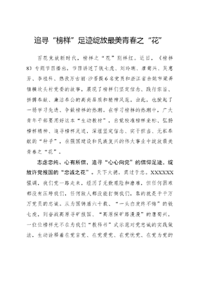 追寻榜样足迹绽放最美青春之花百花竞放新时代,榜样之花别样红。近日,《榜样8》专题节目播出,节目讲述了钱七虎、刘玲琍、唐菊兴、吴惠芳、李桂科、热孜万古丽·沙吾提6名党员和浙江省余姚市梁弄镇横坎头村党委的故事,展现了榜样们坚定信念、践行宗旨、拼搏奉献、廉洁奉公的高尚品质和精神风范。由此,也掀起了一场学习先进、争做榜样的热潮。在学习榜样的热潮中,广大青年干部要用好这本生动教材,自觉校准榜样坐标、弘扬榜样精神、追寻榜样足迹,深埋坚定信念、实干担当、无私奉献的种子,在强国建设和民族复兴的伟大事业中绽放最美青春之花。志虑忠纯、心有所信,追寻心心向党的信仰足迹,绽放许党报国的忠诚之花。天下大德,莫过于忠。XXXXXX强调,我们党一路走来,经历了无数艰险和磨难,但任何困难都没有压垮我们,任何敌人都没能打倒我们,靠的就是千千万万党员的忠诚。从为国铸盾六十载、一头白发终不悔的钱七虎,到奋战高原寻矿报国、高原探矿路漫漫的唐菊兴,一位位榜样无不在为我们教科书式示范对党忠诚的实践做法,生动诠释着在党言党、在党爱党、在党忧党、在党为党的动人篇章。广大青年干部要时刻以榜样为镜,汲取信仰之力,紧绷信念之弦,把对党忠诚作为前行灯塔和价值追求,始终以党的旗帜为旗帜、以党的意志为意志、以党的使命为使命,保持忠于党、忠于国家、忠于人民的政治品格,将个人理想融于党和人民事业,将个人追求与党的期望、人民的期盼结合起来,主动担当作为、坚持无私奉献,在岗位上尽职尽责,让许党报国的忠诚之花别样红。攻坚克难、砥砺奋进,追寻勇往无前的奋斗足迹,绽放笃行拼搏的实干之花。道虽迩,不行不至;事虽小,不为不成。XXXXXX指出:奋斗不只是响亮的口号,而是要在做好每一件小事、完成每一项任务、履行每一项职责中见精神。一片丹心,三尺讲台,辛勤耕耘32年,为折翼天使插上追梦翅膀的刘玲琍;初心不改,笃行不怠,扎根永联18年,打造出新时代乡村振兴永联样本的吴惠芳一位位榜样以实际行动昭示我们,在自己的本职岗位上真抓实干、埋头苦干,葆有一往无前的执着,就能书写属于自己的精彩篇章。广大青年干部要崇尚先进、见贤思齐,学习他们默默耕耘、笃行拼搏的奋斗品质,汲取前行之力,保持艰苦奋斗的政治本色,不惧环境之苦、不畏矛盾之多、不怕事情之繁,沉在岗位上、扑下身子来、安下心神去,以逢山开路、遇水架桥的闯劲,敢想敢为善作善成,做新时代的奋斗者,让笃行拼搏的实干之花别样红。念民所忧、行民所盼,追寻忘己无私的奉献足迹,绽放初心如一的为民之花。民生无小事,枝叶总关情。中国共产党自成立之日起,就把为中国人民谋幸福、为中华民族谋复兴确立为自己的初心使命,始终坚持全心全意为人民服务的根本宗旨,把人民放在心中最高位置。无论是奉献社区20年,大事小事风雨无阻的热孜万古丽·沙吾提,还是40多年如一日给麻风病患者治病、治心、治贫的李桂科,他们都把个人利益置于身后,不计个人得失,奉献祖国、奉献人民,用行动诠释我将无我,不负人民的崇高情怀。榜样就是一面镜子,镜中时刻闪耀着人民至上的光芒,映照为民服务的不变初心。广大青年干部要学习榜样全心奉献,忘己无私的为民情怀,汲取初心之力,把人民至上放在心中最高位置,坚持执政为民,甘当店小二勤务员,多谋民生之利,多解民生之忧,努力在服务人民的过程中实现人生价值,让初心如一的为民之花别样红。