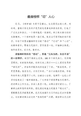 最是榜样动人心近日,《榜样8》专题节目播出,生动展现出钱七虎、刘玲琍、唐菊兴等优秀共产党员的先进事迹和高尚品质,引起了广泛关注和热议。一个榜样就是一面旗帜,树立起向善向好的先锋模样,一个榜样就是一座灯塔,散发出可感可触的情怀感召。年轻干部要读懂榜样背后的感动行动和心动,向榜样看齐,厚植为民情怀、坚守基层一线、怀揣事业热爱,始终追逐光、成为光、散发光。读懂榜样背后的感动,那是无私为民、矢志不渝的一份情怀。破旧不堪的土坯房,180多个麻风病人,有的嘴歪眼斜,有的肢体残缺,有的在地上爬行……让人望而生畏的麻风村,李桂科却毅然决然地留了下来。惟其艰难,才更显勇毅;惟其笃行,才弥足珍贵。四十余载的坚持,李桂科始终将人民置顶于心间,治病治心治贫,他倾尽一生把山石屏村绘就成了一幅幸福画卷。广大年轻干部要厚植为民情怀,改进群众工作方法,多深入基层一线,与群众面对面交心,了解群众的所急所难所盼,稳扎稳打练就为民服务硬功夫,要勤勤恳恳多做惠民事,把为民造福作为工作的出发点和落脚点,切实解决群众迫切的急难愁盼问题,做好群众关注的民生关键小事,切实让群众感受到服务就在身边,温暖就在身旁。读懂榜样背后的行动,那是扎根基层,自得其芳的一份坚守。把支部建在小区上、小组落在楼栋里,将19名社区党员干部和131名居民党员混合编组,按照社区党委—网格党支部—楼栋党小组—微网格四级网格治理体系,织密党建引领基层治理一张网。真者,精诚之至也,不精不诚,不能动人。十四个春秋,热孜万古丽·沙吾提始终扎根基层一线,听群众心声,解居民之忧,把工作做到群众的心坎里,让居民生活像花儿一样。广大年轻干部要感悟坚守的力量,切实扎根基层一线,立足自身的岗位,把普通事干出彩,把为民事干精彩,要鼓足抓铁有痕的毅力、蓄足乘风破浪的底气,在火热的工作实践中锤炼干事本领,增强实干能力,以马上就办,真抓实干的执行力做好做实做细每一件事,让小岗位展现大作为。读懂榜样背后的心动,那是功崇惟志,业广惟勤的一份热爱。面对严重的外部威胁,面对一项项世界级国防工程的防护难题,钱七虎不惧困难挑战,于艰苦环境中拼搏进取,攻坚克难,以超乎常人的意志力让一个个不可能成为可能,带领团队制定了我国首部人防工程防护标准,解决了核武器和常规武器工程防护一系列关键技术难题。非知之难,行之为难;非行之难,终之斯难。六十年如一日,钱七虎为铸就坚不可摧地下钢铁长城默默奉献着。越是伟大的事业越是充满挑战,越需要知重负重。基层工作冗杂,风雨交加是常态。广大年轻干部要杜绝畏难情绪,不因挫折而停滞不前,不因困难而犹豫放弃,要有敢教日月换新天的昂扬斗志,埋头苦干、勤学苦练,多啃硬骨头,夯实真功夫,锤炼出守土有责、守土负责、守土尽责的责任担当,在广袤的基层挥洒汗水与热爱,书写出不负时代的青春答卷。