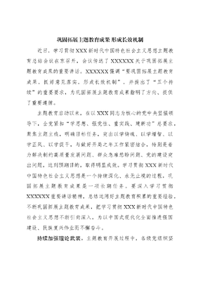 巩固拓展主题教育成果 形成长效机制近日,学习贯彻XXX新时代中国特色社会主义思想主题教育总结会议在京召开,会议传达了XXXXXX关于巩固拓展主题教育成果的重要讲话。XXXXXX强调要巩固拓展主题教育成果,抓好意见落实,形成长效机制,并提出了五个持续的重要要求,为巩固拓展主题教育成果指明了方向、提供了重要遵循。主题教育启动以来,在以XXX同志为核心的党中央坚强领导下,全党紧扣学思想、强党性、重实践、建新功总要求,聚焦主题主线,明确目标任务,突出以学铸魂、以学增智、以学正风、以学促干,与做好开局之年工作紧密结合,特别是着力解决制约高质量发展问题、群众急难愁盼问题、党的建设突出问题,达到预期目的,取得明显成效。学习贯彻XXX新时代中国特色社会主义思想是一个持续深化、永无止境的过程,巩固拓展主题教育成果是一项长期任务。要深入学习贯彻XXXXXX重要讲话精神,总结运用好主题教育积累的重要经验,不断巩固拓展主题教育成果,把学习贯彻XXX新时代中国特色社会主义思想不断引向深入,为以中国式现代化全面推进强国建设、民族复兴伟业而不懈奋斗。持续加强理论武装。主题教育开展过程中,各级党组织坚持第一议题制度,用好五学联动有效机制,引导广大党员干部静下心来读原著、学原文、悟原理,不断提高思想认识、感悟真理力量。近日,XXXXXX在天津考察时指出,学理论是一个不断积累、不断深化的过程。学无止境,学贵有恒。要持之以恒深学细悟XXX新时代中国特色社会主义思想,教育引导党员干部通过坚持学习党的创新理论,悟规律、明方向、学方法、增智慧,固本培元、凝心铸魂,进一步打牢党的团结统一的思想基础。持续推动解决问题。主题教育开展过程中,广大党员干部坚持问题导向,深入开展调查研究,深入检视问题,全面查找自身不足和工作偏差,正确对待和自觉接受党内外监督,狠抓整改整治,着力从思想根源和制度机制上解决问题。有些问题通过这次主题教育解决了,有些问题是硬骨头需要长久发力解决,同时发展过程中还会有新的问题出现。要继续抓好整改整治、建章立制,一项一项落实整改措施,让人民群众切实感受到解决问题的实际成效,让人民群众有获得感。持续改进作风。主题教育期间,XXXXXX亲切会见全国枫桥式工作法入选单位代表,勉励他们坚持和发展好新时代枫桥经验;就防止形式主义、解决基层治理小马拉大车问题等作出一系列重要批示。在XXXXXX引领推动下,文可居文库——海量学习资料,手机电脑均可下载www.wenkeju.com广大党员干部驰而不息正作风、治歪风、树新风。作风建设永远在路上,要落实四下基层,坚持和发展新时代枫桥经验,走好新时代群众路线,纠治形式主义、官僚主义,切实抓好整治形式主义为基层减负工作。大兴务实之风、清廉之风、俭朴之风,发扬自我革命精神,组织开展好集中性纪律教育,让新风正气在新征程上不断充盈。持续夯实基层基础。这次主题教育自上而下分两批进行,第二批更加注重基层。广大党员干部深入群众听取意见,把解决群众的操心事烦心事揪心事作为着力点,落实落细惠民政策和为民服务,强化了基层工作、密切了党同人民群众的血肉联系。基层是国家治理的最末端、服务群众的最前沿。要坚持大抓基层的鲜明导向,推进以党建引领基层治理,把党的领导贯穿基层社会治理的各领域各方面各环节,充分发挥基层党组织战斗堡垒作用和党员先锋模范作用,推进基层治理体系和治理能力现代化。持续抓好落实。主题教育开展过程中,各级党组织把开展主题教育同推动本地区本部门本单位的中心工作结合起来,做到两手抓、两促进,不断匡正干的导向、增强干的动力、形成干的合力,全力推动党中央决策部署落实落地。大道至简,实干为要。2024年,是实现十四五规划目标任务的关键一年。文可居文库——海量学习资料,手机电脑均可下载www.wenkeju.com要树牢正确政绩观,坚持问题导向,实事求是、因地制宜,重实干、做实功、求实效,更好将主题教育成果转化为推动高质量发展的成效。巩固拓展主题教育成果是一项重大政治任务,纪检监察机关作为政治机关必须带头贯彻落实好。二十届中央纪委三次全会作出的八个方面工作部署,首先就是突出凝心铸魂深化拓展主题教育成果。各级纪检监察机关要始终做XXX新时代中国特色社会主义思想的坚定信仰者、忠实实践者,更加自觉用XXX新时代中国特色社会主义思想锤炼党性作风、破解工作难题、担当使命责任,以彻底的自我革命精神锻造高素质专业化纪检监察队伍,纵深推进纪检监察工作高质量发展,在新征程上为了党和人民事业团结奋斗、永远冲锋。文可居文库——海量学习资料,手机电脑均可下载www.wenkeju.com