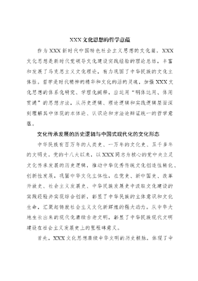 XXX文化思想的哲学意蕴作为XXX新时代中国特色社会主义思想的文化篇,XXX文化思想是新时代党领导文化建设实践经验的理论总结,丰富和发展了马克思主义文化理论,有力巩固了中华民族的文化主体性。哲学是时代精神的精华和文化的活的灵魂,加强XXX文化思想的体系化研究、学理化阐释,应运用明体达用、体用贯通的思想方法,从历史逻辑、理论逻辑和实践逻辑层面深刻理解其中体现的本体论、认识论和方法论辩证统一的哲学意蕴。文化传承发展的历史逻辑与中国式现代化的文化形态中华民族有百万年的人类史、一万年的文化史、五千多年的文明史。党的十八大以来,以XXX同志为核心的党中央立足文化传承发展的历史逻辑,推动中华优秀传统文化创造性转化、创新性发展,巩固中华文化主体性,在党史、新中国史、改革开放史、社会主义发展史、中华民族发展史中汲取文化建设的实践经验并实现综合创新,彰显了中华民族的主体意识和文化生命,汇聚起铸就社会主义文化新辉煌的强大动力。从中华大地生长出来的现代化赓续古老文明,彰显了中华民族现代文明建设在社会主义发展史上的里程碑意义。首先,XXX文化思想赓续中华文明的历史根脉,体现了中华文化和中国精神的时代精华,深化了对中华文明发展规律的认识。纵观人类文明史可见,很多原生或次生的文明在发展过程中都已中断或湮灭在历史的烟尘中,唯有中华文明绵延不绝。中华文明之所以文脉悠长,是因其具有鲜明的连续性、创新性、统一性、包容性、和平性,在历史长河中将中国人的宇宙观、天下观、社会观、道德观不断对象化并丰富发展。以世界文明发展历程为参照,深刻理解中华文明绵延永续的根由,把握中华文明讲仁爱、重民本、守诚信、崇正义、尚和合、求大同的精神特质,就会认识到巩固中华文化主体性的重要意义。XXXXXX强调中华优秀传统文化是我们党创新理论的根,蕴藏着解决当代人类面临的难题的重要启示:只有立足波澜壮阔的中华五千多年文明史,才能真正理解中国道路的历史必然、文化内涵与独特优势。文化主体性是一个国家和民族自我意识的核心,是文化自觉和文化自信之源,是一个不断建构的过程。中华优秀传统文化视通万里、融汇古今,积淀着丰厚的文化资源,具有充盈的文化创造力,其在日常生活中具体化,成为体现文化主体性的历史实在。近代以来,国家蒙辱、人民蒙难、文明蒙尘,可歌可泣的中华儿女在奋力实现民族独立和解放的同时,书写了一部精神上自立自信自强的中华文化重焕荣光的历史,使中华文明实现了从传统到现代的跨文可居文库——海量学习资料,手机电脑均可下载www.wenkeju.com越。继承珍贵的文化遗产并使之实现创造性转化、创新性发展,丰富中国人独特的精神世界,阐明人民群众日用而不觉的价值观具有的文明内涵,是以中国式现代化全面推进中华民族伟大复兴的文化前提。作为改革开放以来我们取得一切成绩和进步的根本原因之一,中国特色社会主义文化繁荣发展是党团结带领人民接续奋斗的结果,体现了党对实现创造性转化和创新性发展的中华优秀传统文化的精神实质、道德规范、价值关怀及其生命力和创造力的自信,为中国特色社会主义道路确立了深远宏阔的文化根基。在中国特色社会主义道路上弘扬跨越时空、超越国度、富有永恒魅力、具有当代价值的优秀文化精神,体现了新的文化生命体的主体性自觉,使中华文明贞下起元,创造了中华民族的旧邦新命,汇聚起建设中华民族现代文明的强大精神力量。其次,XXX文化思想在新时代新征程上彰显高度的文化自信,坚持党的文化领导权,深化了对党的创新理论的规律性认识。作为中国先进文化的积极引领者和践行者与中华优秀传统文化的忠实传承者和弘扬者,我们党自成立起,就提出建立中华民族新文化的纲领和主张,致力于建设民族的、科学的、大众的新文化。文可居文库——海量学习资料,手机电脑均可下载www.wenkeju.com新中国成立后,毛泽东同志提出百花齐放、百家争鸣的方针,提出古为今用,洋为中用的文化建设原则,秉持独立自主、实事求是的文化精神,顺应繁荣文化艺术、发展科学技术的时代要求,指明文艺为人民大众服务的发展方向,强调培养有社会主义觉悟的有文化的劳动者,倡导科学文化现代化。改革开放新时期,邓小平同志从战略高度强调要在建设高度物质文明的同时,提高全民族的科学文化水平,发展高尚的丰富多彩的文化生活,建设高度的社会主义精神文明;教育要面向现代化,面向世界,面向未来;提高中华民族的思想道德素质和科学文化素质。进入新时代,XXXXXX将坚定文化自信视为事关国运兴衰、事关文化安全、事关民族精神独立性的大问题,明确提出坚持党的文化领导权,强调坚持以人民为中心,深刻回答了中国特色社会主义文化建设举什么旗、走什么路、坚持什么原则、实现什么目标等根本问题。深刻揭示了中华文化的精神标识,保护承载中华民族基因和血脉的文化遗产,赓续历史文脉,更好实现