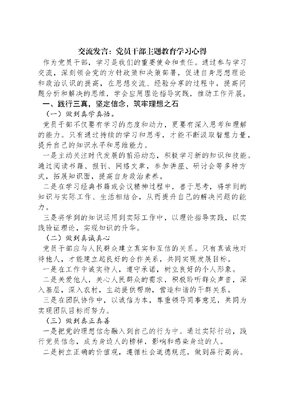交流发言:党员干部主题教育学习心得作为党员干部,学习是我们的重要使命和责任。通过参与学习交流,深刻领会党的方针政策和决策部署,促进自身思想理论和政治认识的提高,在思想交流、经验分享的过程中,提高问题分析和解决的思维,学会应用理论指导实践,推动工作开展。一、践行三真,坚定信念,筑牢理想之石(一)做到真学真悟。党员干部不仅要有学习的态度和动力,更要有深入思考和理解的能力。只有通过持续的学习和思考,才能不断汲取智慧力量,提升自己的知识水平和思维能力。一是主动关注时代发展的前沿动态,积极学习新的知识和技能。通过阅读书籍、报刊、网络文章,参加讲座、研讨会等多种方式,拓展知识面,提高自身政治素养。二是在学习经典书籍或会议精神过程中,善于思考,将学到的知识与实际工作、生活相结合,从而提升自己的解决问题的能力。三是将学到的知识运用到实际工作中,以理论指导实践,以实践验证理论,实现知识的升华。(二)做到真诚真心党员干部应与人民群众建立真实和互信的关系。只有真诚地对待他人,才能建立起良好的合作关系,共同实现发展目标。一是在工作中诚实待人,遵守承诺,树立良好的个人形象。二是关爱他人,关心人民群众的需求,积极聆听群众声音,深入基层,深入农村,主动提供帮助,营造和谐的干群关系。三是在团队协作中,以诚信为本,尊重领导同事意见,共同为实现团队目标而努力。(三)做到真正真善一是把党的理想信念融入到自己的行为中。通过实际行动,践行党员信念,成为身边人的榜样,影响和感染身边的人。二是树立正确的价值观,遵循社会道德规范,做到品行高尚。三是保持积极乐观的心态,敢于面对困难和挑战,要有勇气去克服,带领人民群众勇往直前。二、提升三力,融通致用,走稳进阶之路(一)提升自主思考和判断力。一是从他人的观点中获取信息,根据自己对问题的理解和认识,进行独立思考和判断。只有拥有独立思考和判断的能力,才能更好地应对复杂的局面。培养批判性思维:不盲目追随他人的观点,要有辨别能力,理性思考问题,形成独立的见解。二是从多个角度出发,全面了解问题的各个方面,以便能够做出更全面的判断和决策。三是善于运用各种资源,如书籍、网络、专业人士、人民群众等,获取广泛信息,进行独立的分析和判断。(二)提升学习和适应力。不断学习新的知识和技能,提升自己的适应能力,在不同的情况下,能够快速调整自己的思维和行动方式。一是将学习作为一种习惯,不断拓展知识领域,获取新的技能和工作方法。二是面对变化时,积极主动灵活适应,不断调整自己的思维和行动方式,应对复杂的局面。三是勇于尝试新的方法和思维模式,开拓创新的思路,追求更高的效率和质量。(三)提升团队合作和沟通能力。一是善于倾听,理解人民群众和领导同事的观点和需求,尊重团队成员的意见,建立互信互帮关系。二是充分沟通,有效地表达自己的意见和需求,与团队成员进行沟通,达成共识。三是分工合作,根据团队成员的优势和特长,合理分配任务,协同合作,实现共同目标。三、履行三扛,勇担重任,握好方向之帆。(一)扛起责任。文可居文库——海量学习资料,手机电脑均可下载www.wenkeju.com在工作中,面对困难和挑战,要有勇气去承担责任,积极解决问题,不推卸责任。主动承担工作任务,积极寻求解决问题的办法,不断提高自己的工作能力和水平。(二)扛起使命。一是设定清晰、具体的工作目标,不断追求目标,提高自己的工作效率和质量。二是不断提高工作标准,追求卓越的工作表现,不断提升自己的综合素质和能力水平。三是面对新的工作要求和挑战,勇于创新,寻求新的工作方法和思路,提高自己的创新能力和解决问题的能力。(三)要扛起民生。一是从社会发展的角度出发,关注社会发展的需要和人民群众的利益,关注地方的高质量发展。二是积极投身到社会事务中,为社会的发展贡献自己的力量,关注民生问题,积极参与社会公益事业。三是遵守社会道德规范和法律法规,诚信待人,诚实守信,树立良好的个人形象和社会形象。在学习中汲取智慧力量,在践行中彰显使命担当,我们才能不断成长和进步,为实现个人价值和社会进步做出更大的贡献。文可居文库——海量学习资料,手机电脑均可下载www.wenkeju.com