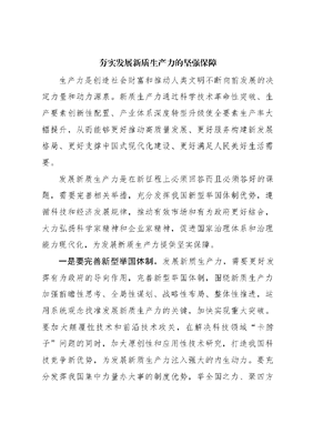 夯实发展新质生产力的坚强保障生产力是创造社会财富和推动人类文明不断向前发展的决定力量和动力源泉。新质生产力通过科学技术革命性突破、生产要素创新性配置、产业体系深度转型升级使全要素生产率大幅提升,从而能够更好推动高质量发展、更好服务构建新发展格局、更好支撑中国式现代化建设、更好满足人民美好生活需要。发展新质生产力是在新征程上必须回答而且必须答好的课题,需要完善相关举措,充分发挥我国新型举国体制优势,遵循科技和经济发展规律,推动有效市场和有为政府更好结合,大力弘扬科学家精神和企业家精神,促进国家治理体系和治理能力现代化,为发展新质生产力提供坚实保障。一是要完善新型举国体制。发展新质生产力,需要更好发挥有为政府的导向作用,完善新型举国体制,围绕新质生产力加强前瞻性思考、全局性谋划、战略性布局、整体性推进,运用系统观念找准发展新质生产力的关键,加快实现重大突破。要加大颠覆性技术和前沿技术攻关,在解决科技领域卡脖子问题的同时,加大原创性和应用性技术研究,打造我国科技竞争新优势,为发展新质生产力注入强大的内生动力。要充分发挥我国集中力量办大事的制度优势,举全国之力、聚四方之才,扎实推进科技强国建设,通过科技创新的重大突破催生新质生产力。要强化国家战略科技力量,充分发挥企业技术创新主体作用,将优质要素更多集聚到发展新质生产力的关键领域,实现发展质量、结构、规模、速度、效益、安全的有机统一。二是要加快建设全国统一大市场。形成新质生产力需要对生产要素进一步优化配置,从而形成更高的生产能力。在此过程中,要充分发挥市场配置资源的决定性作用,不断提高全要素生产率。加快建设高效规范、公平竞争、充分开放的全国统一大市场,打破地方保护和市场分割,打通制约经济循环的关键堵点,促进商品要素资源在更大区域范围内畅通流动,全面推动我国市场由大到强转变,推动经济发展的质量变革、效率变革、动力变革。要充分发挥法治的引领、规范、保障作用,加强诚信建设,加强知识产权保护,加快建立全国统一的市场制度规则,为各类经营主体创造稳定、透明、规范、可预期的法治环境,让企业真正成为创新主体,让人才、资金等各类创新要素向能够形成新质生产力的领域聚集。同时,还要进一步健全要素参与收入分配机制,激发劳动、知识、技术、管理、数据和资本等生产要素的活力。三是要促进科技创新和产业创新深度融合。发展新质生产文可居文库——海量学习资料,手机电脑均可下载www.wenkeju.com力,要以科技创新推动产业创新,通过推进科技创新和产业创新的深度融合,加快将科技资源优势转化为产业发展优势,畅通科技成果转化为现实生产力的渠道。科学家精神是科技工作者在长期科学实践中积累的宝贵精神财富,勇于创新的企业家精神是宝贵的社会资源,能够为发展新质生产力提供精神力量。要大力弘扬科学家精神和企业家精神,营造鼓励大胆创新、诚信经营、勇于奋进的良好氛围,激发科技创新和产业创新活力。要把科技创新融入中国式现代化建设,努力实现更多从0到1的突破,并推进产业创新不断实现从1到N的应用转化。要以科技创新为引领,加快传统产业转型升级,以颠覆性技术和前沿技术催生新产业、新模式、新动能,促进战略性新兴产业蓬勃发展,有序布局未来产业发展,为发展新质生产力提供更多产业支撑。四是要推进国家治理体系和治理能力现代化。形成新质生产力除了科技因素外,制度因素也尤为重要。要通过全面深化改革,推进国家治理体系和治理能力现代化,为发展新质生产力提供制度保障,从而更广泛调动各方面积极性、主动性、创造性,不断塑造新的竞争优势。一方面要加快建立并不断完善体制机制、法律法规,使支撑新质生产力的各方面制度更加规范科学;另一方面要通过深化改革加快破除不适应发展新质生文可居文库——海量学习资料,手机电脑均可下载www.wenkeju.com产力要求的各种束缚。同时,更加注重治理能力建设,加强知识产权保护,持续努力打造市场化、法治化、国际化一流营商环境,形成具有全球竞争力的开放创新生态,激发各类经营主体的活力,持续把我国国家治理体系和治理能力优势转化为发展新质生产力的动力。文可居文库——海量学习资料,手机电脑均可下载www.wenkeju.com
